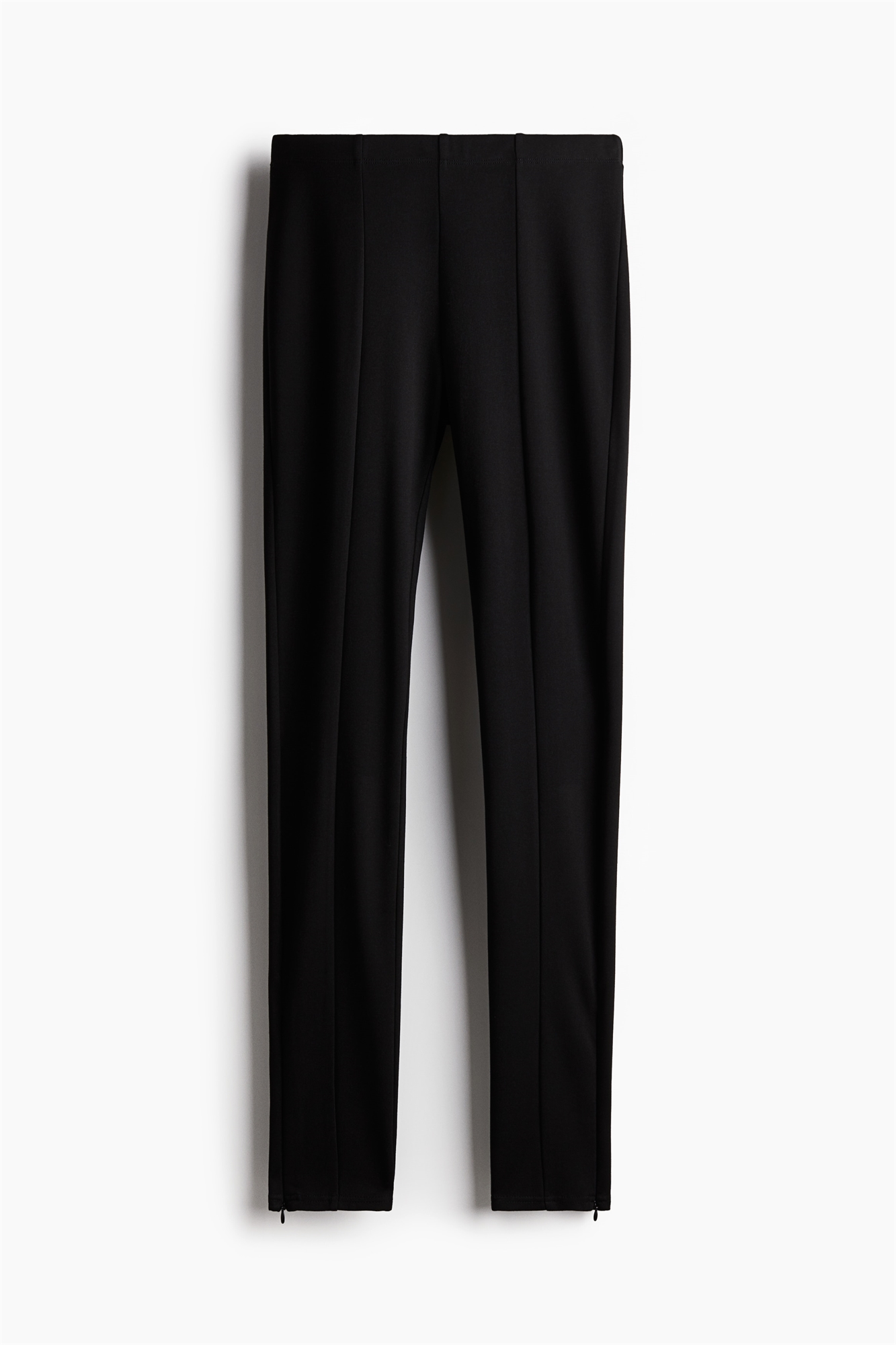 Леггинсы из плотного джерси со скрытой эластичной резинкой на талии, видимыми швами спереди и потайной застежкой-молнией по краям.