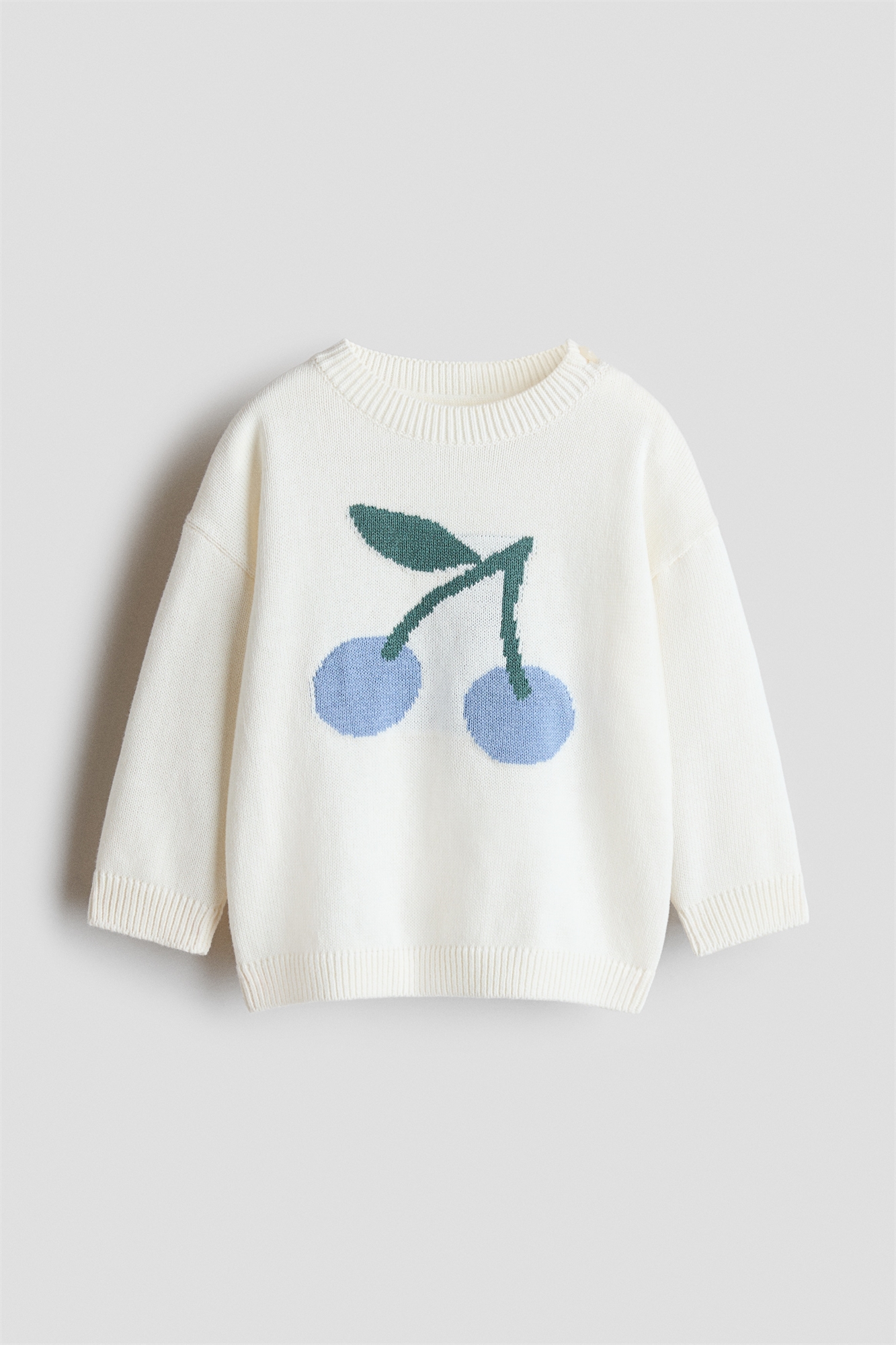 Джемпер с длинными рукавами из мягкого хлопка жаккардовой вязки с пуговицами на одном плече, спущенными плечами и тесемками по вырезу, манжетам и подолу.