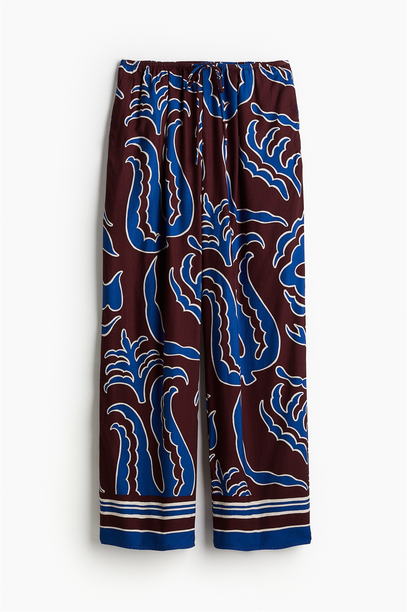 Свободные брюки из мягкой саржи из смеси вискозы и льна. Высокая талия с эластичной отделкой и узким шнурком, незаметные боковые карманы и прямые ноги с двухслойными каймами.