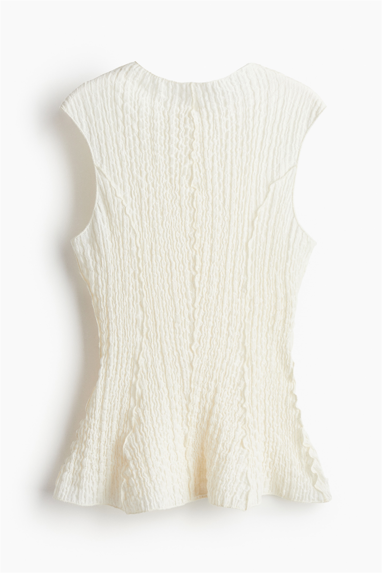 Облегающий топ из фактурного джерси с воротником-стойкой и расклешенной баской. Оверлочные края по вырезу горловины, подолу и спереди.