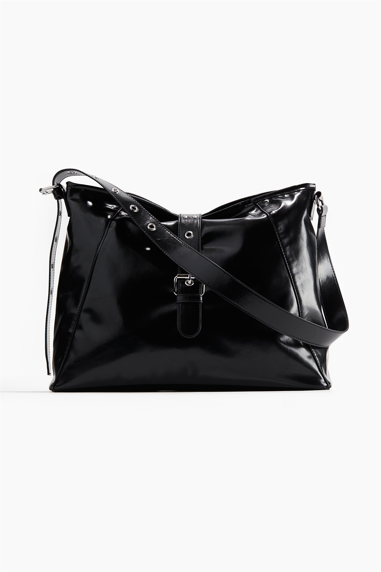 Сумка-кроссбоди из мелованной ткани с застежкой-молнией в верхней части и регулируемым плечевым ремнем. Ремешок с декоративной пряжкой и скрытой магнитной застежкой спереди. Подкладка из тафты. Глубина 10 см. Высота 28 см. Ширина 36 см.