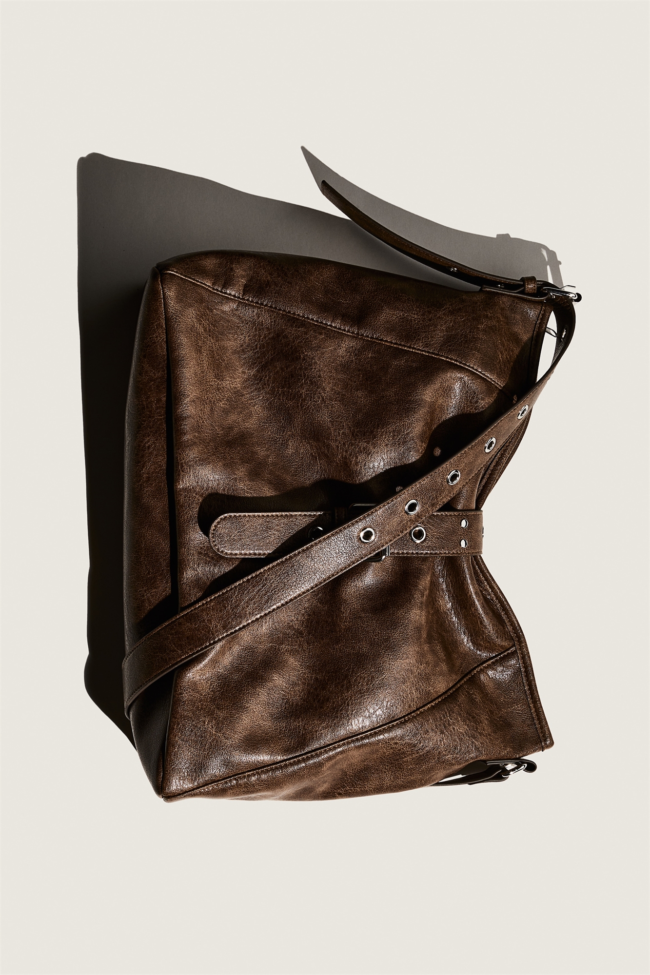 Сумка-кроссбоди из мелованной ткани с застежкой-молнией в верхней части и регулируемым плечевым ремнем. Ремешок с декоративной пряжкой и скрытой магнитной застежкой спереди. Подкладка из тафты. Глубина 10 см. Высота 28 см. Ширина 36 см.