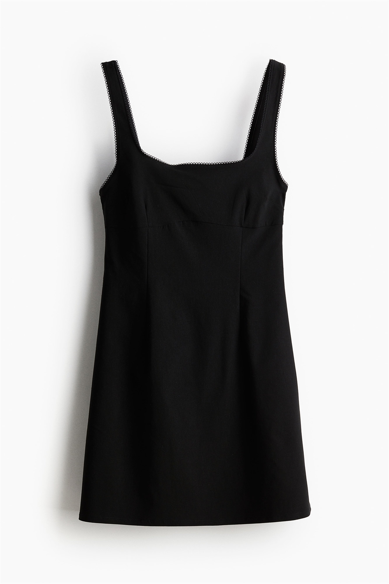 Короткое платье без рукавов из стрейчевого джерси с нежной отделкой пико. Квадратный вырез спереди, формованные чашечки, формирующие швы спереди и сзади на талии и низкий вырез сзади. Потайная застежка-молния с одной стороны, приталенный лиф и расклешенная юбка. На подкладке.