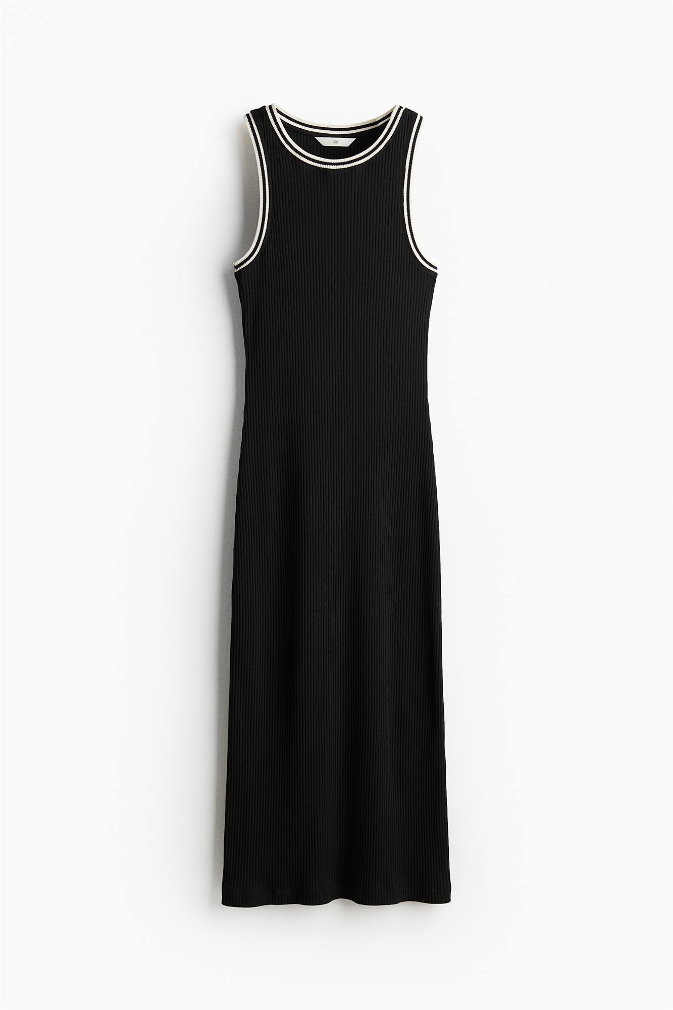 Приталенное платье без рукавов длиной до колена из ребристого трикотажа с круглым вырезом и акцентной отделкой по вырезу и проймам.