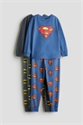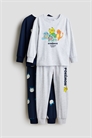 Пижама из мягкого хлопкового трикотажа с набивным рисунком. Верхняя часть с длинными рукавами, круглым вырезом и ребристыми манжетами. Низ с эластичной талией и ребристыми краями.