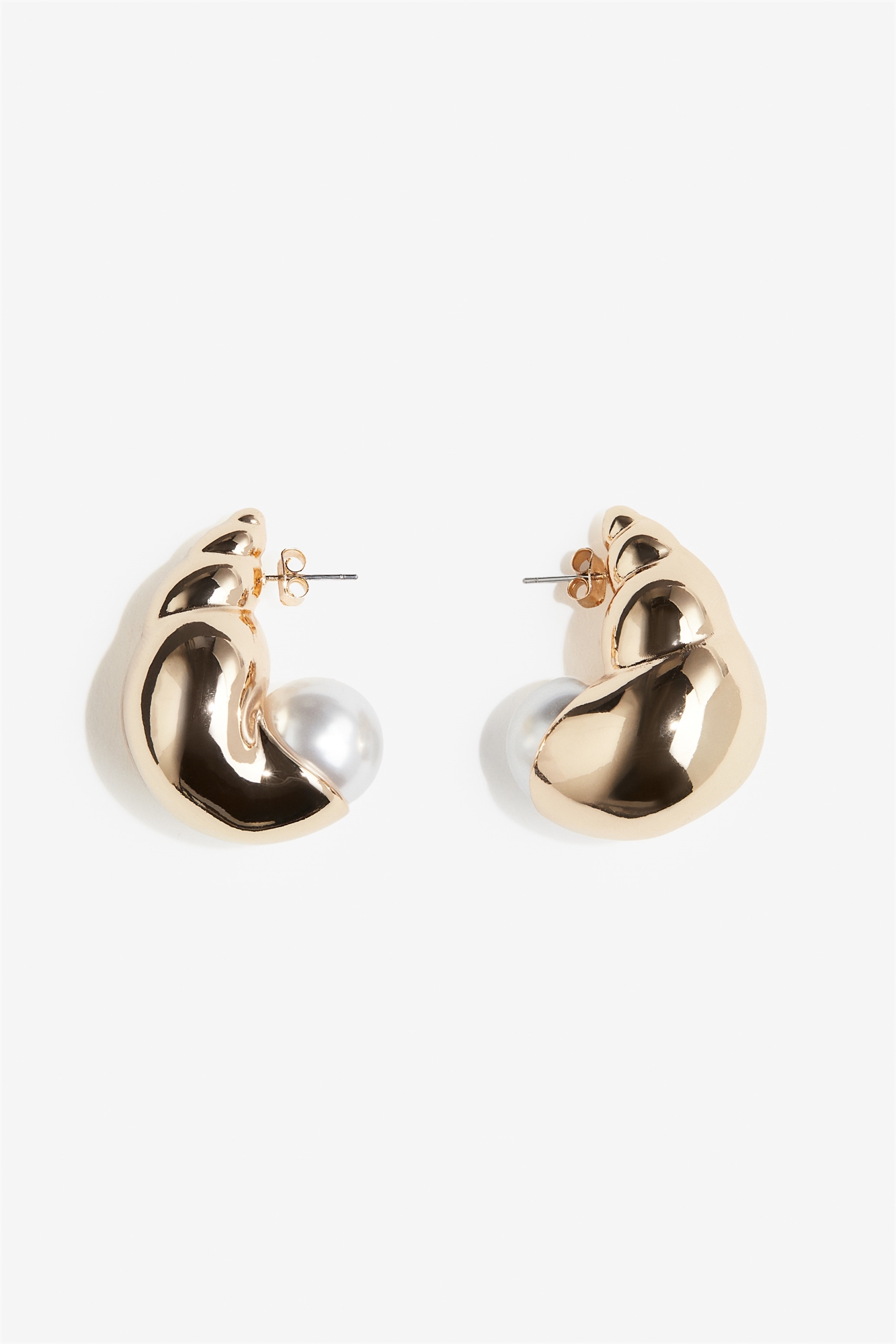 Пластиковые серьги-купола в форме ракушки с блестящим металлическим покрытием и перламутровой бусиной.