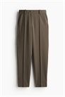 Приталенные брюки длиной до щиколоток из тканого материала с высокой талией, застежкой на молнию и пуговицу. Диагональные боковые карманы, втачные карманы сзади и зауженные ноги с застроченными складками спереди, приталенными складками сзади и небольшим разрезом на подоле.