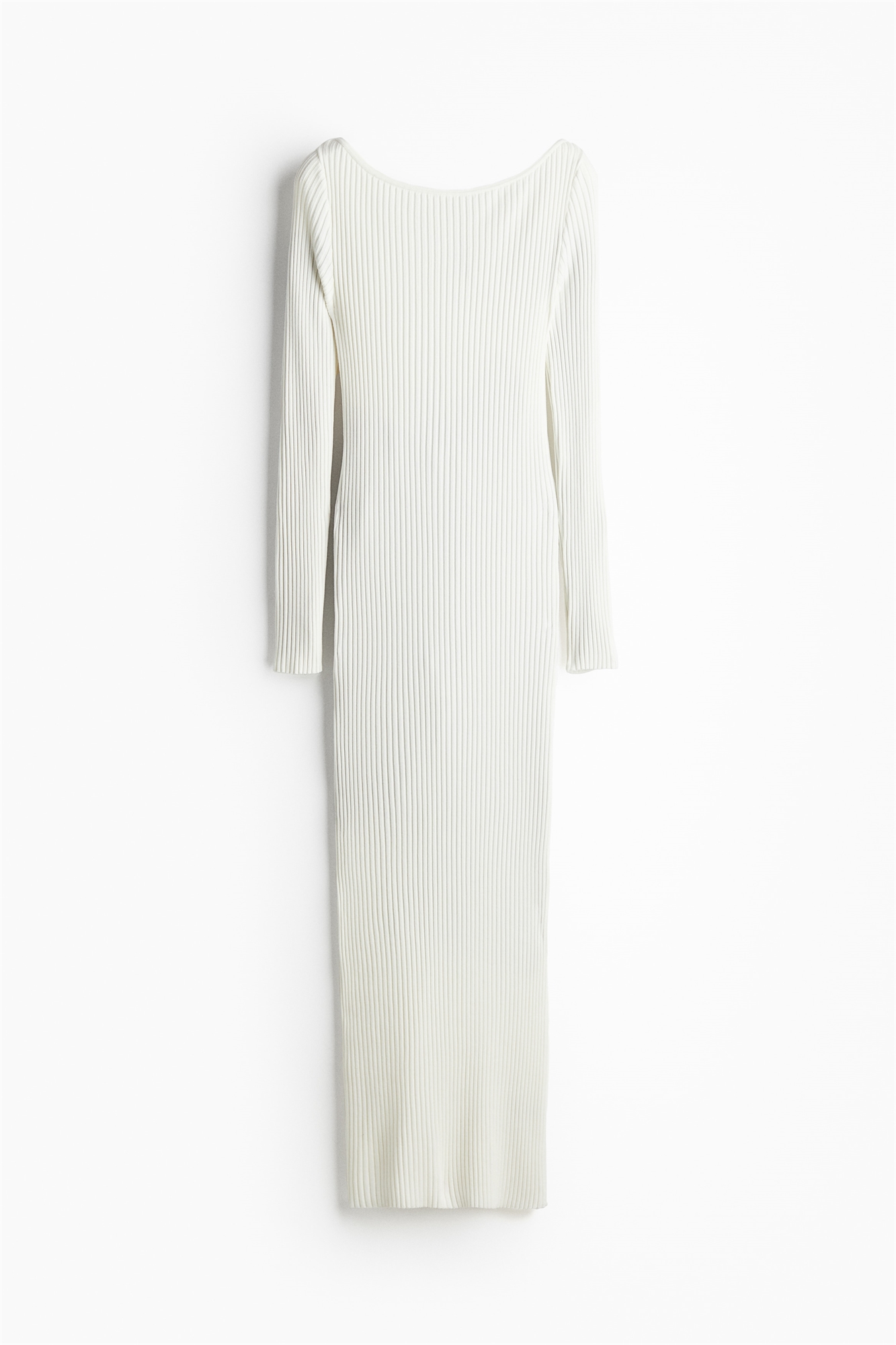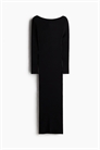 Приталенное платье длиной до колен из мягкого трикотажа в рубчик с вырезом-лодочкой и длинными рукавами.