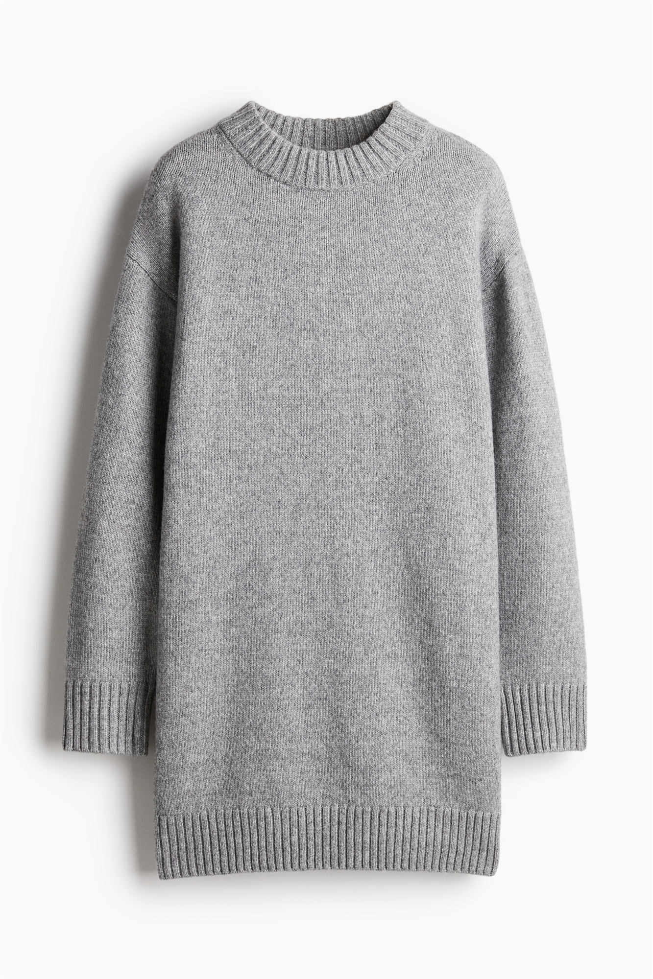 Короткое платье свободного покроя из мягкого трикотажа со спущенными плечами и длинными рукавами. Окантовка по вырезу горловины, манжетам и подолу.