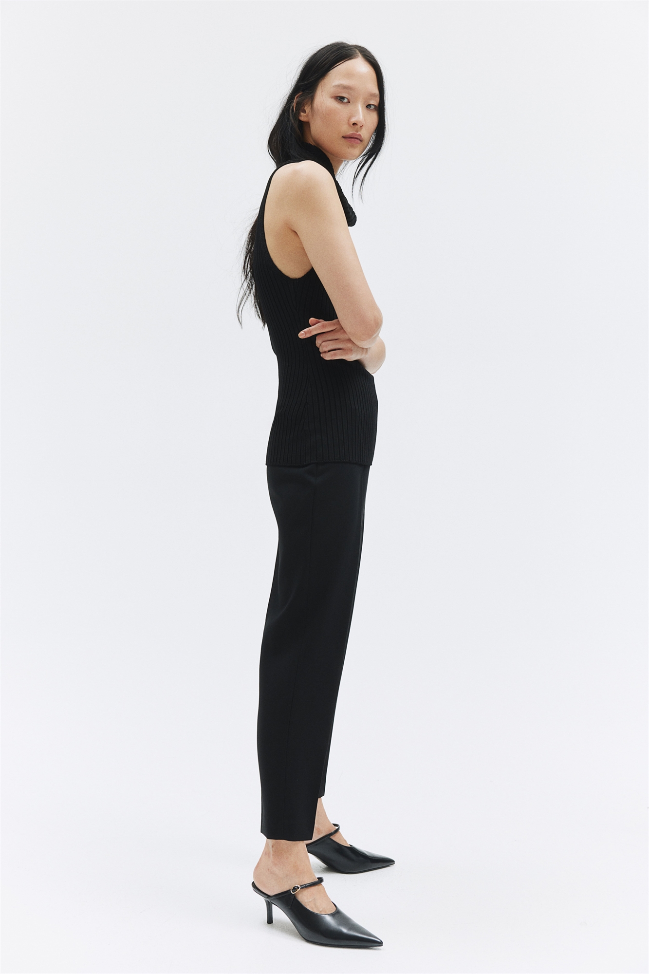 Приталенные брюки длиной до щиколоток из саржи с высокой талией со скрытой эластичной резинкой и ширинкой на молнии с потайными застежками-крючками. Поддельные карманы сзади и зауженные ноги со складками спереди и сзади.