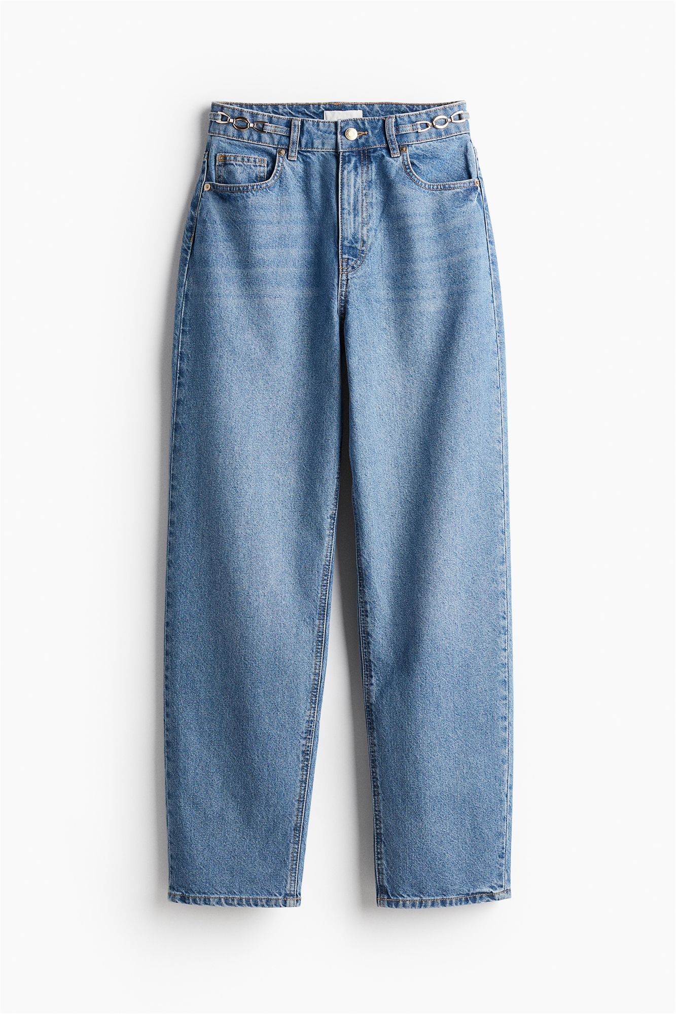 Джинсы с 5 карманами из жесткого хлопкового денима с прямыми ногами, сужающимися к подолу. Высокая талия, ширинка на молнии, пуговица и металлическая цепочка по бокам.
