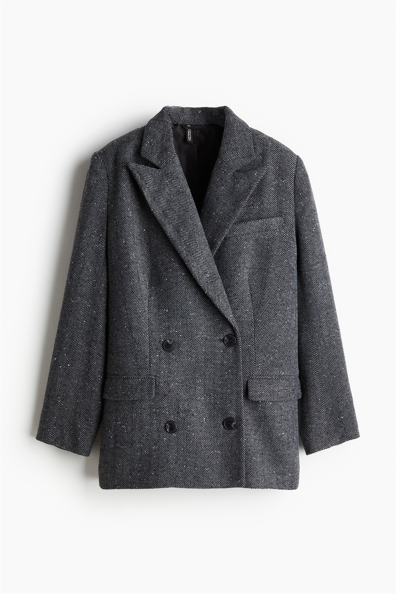 Свободный двубортный блейзер из тканого материала с широкими лацканами, застежкой на пуговицы спереди и декоративными пуговицами на манжетах. Нагрудный карман, накладные передние карманы и один задний клапан. На подкладке.