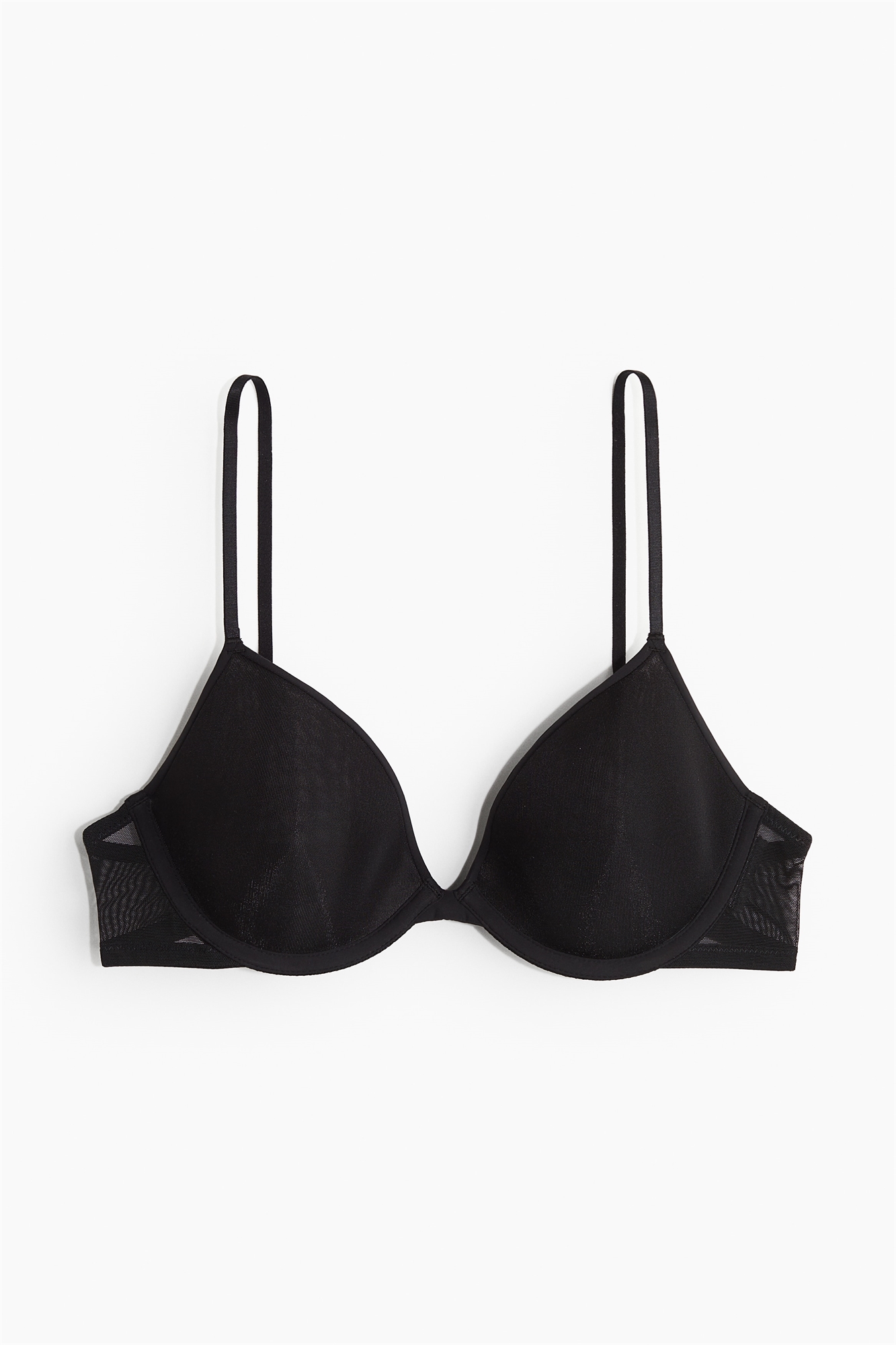 Бюстгальтер с заниженной посадкой из сетки с поролоновыми прокладками, обеспечивающими легкость, воздухопроницаемость и высокую степень поддержки. Регулируемые бретели и узкая застежка-крючок сзади.