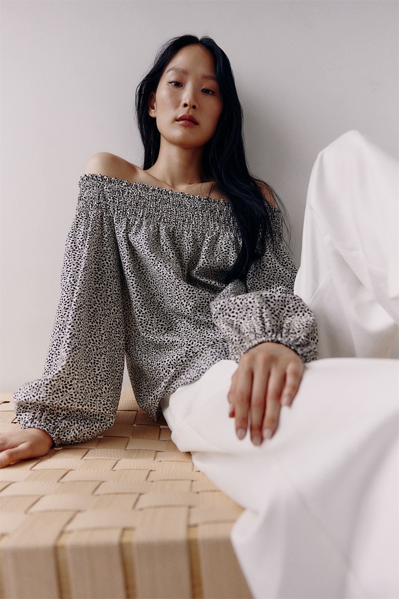 Блузка на плечах из воздушной смеси лиоцелла. Модель с широкой планкой и небольшим воланом в верхней части и длинными рукавами-баллончиками с узким эластичным подолом. Свободный крой.