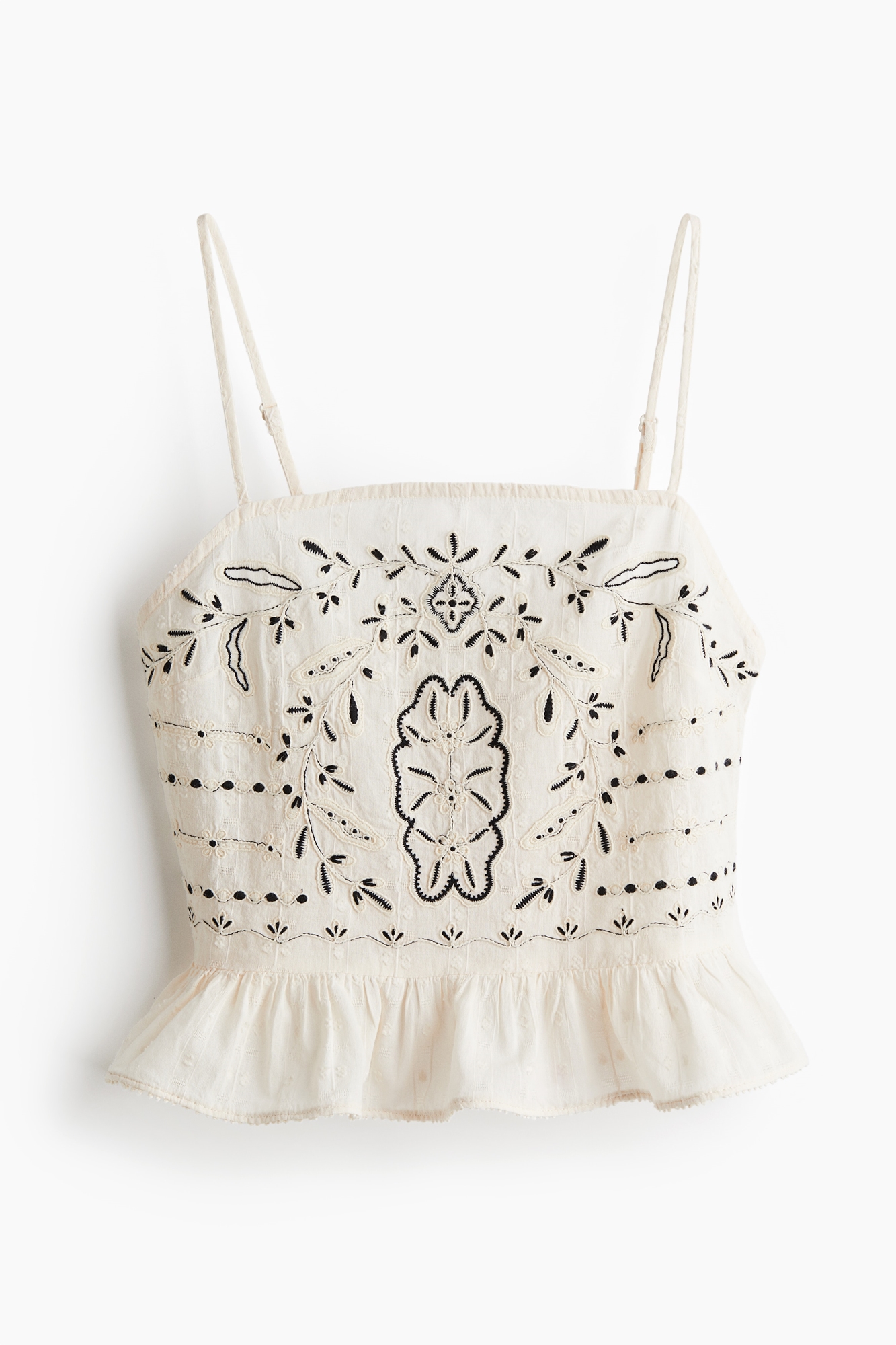 Приталенный топ из хлопковой салфетки с вышивкой спереди. Узкие регулируемые бретели, широкая планка на спине и подол со складками.