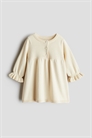Платье из мягкого тонкого трикотажного хлопка с пуговицами на одном плече, длинными рукавами и воланом на манжетах. Сборки на талии и слегка расклешенная юбка.