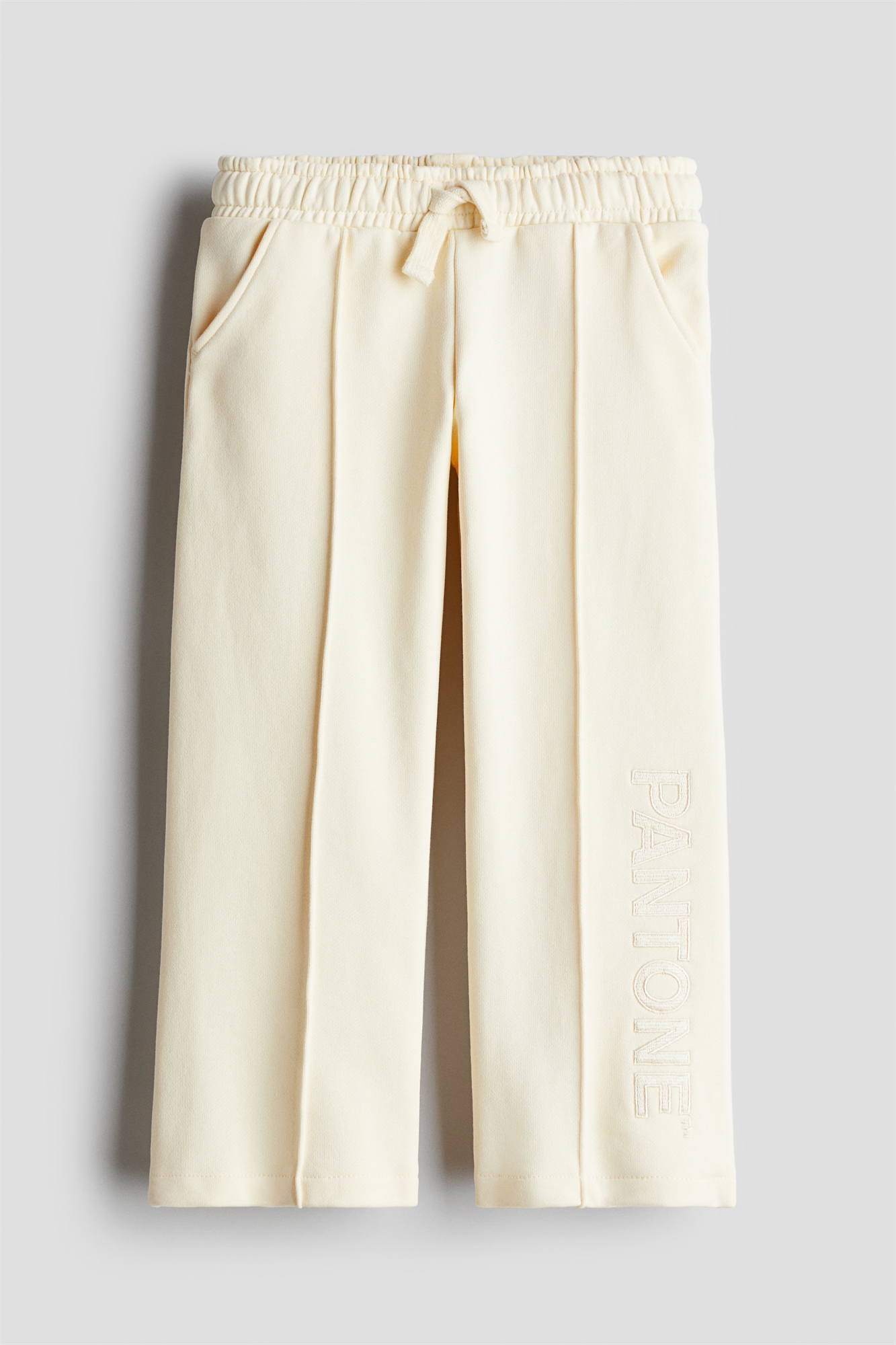 H&M x PANTONE. Джоггеры из легкой толстоватой ткани с вышитым текстовым мотивом на одной штанине. Эластичный пояс с завязками, диагональные боковые карманы и широкие штанины с застроченными складками спереди.