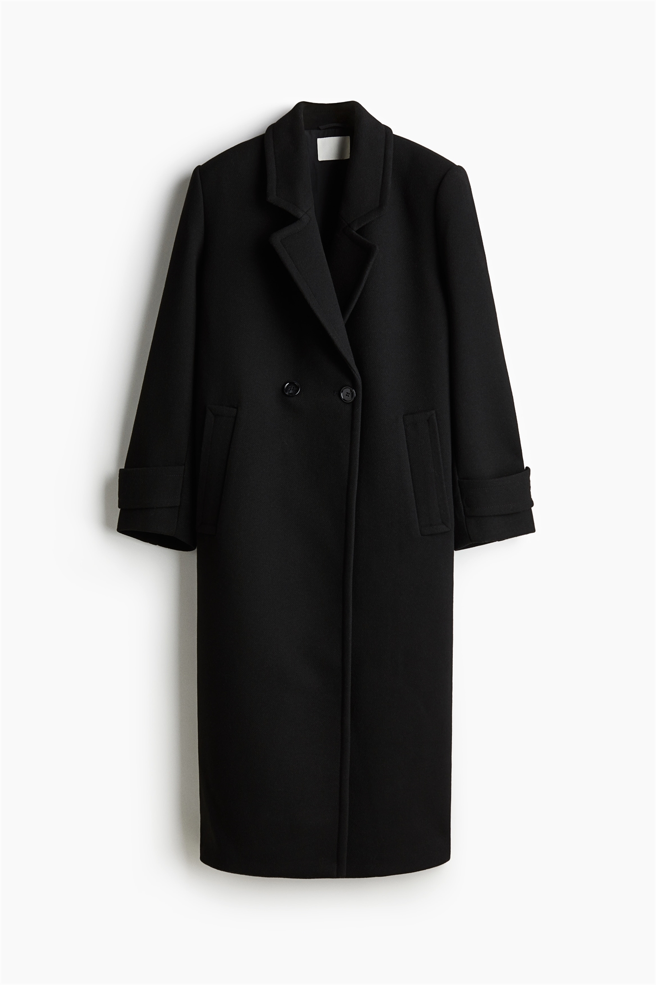 Длинное пальто из тканого материала с лацканами с вырезом, пуговицами спереди и длинными рукавами с манжетами на пуговицах. Прорезные боковые карманы и одинарный вентиляционный прорез сзади. На подкладке.