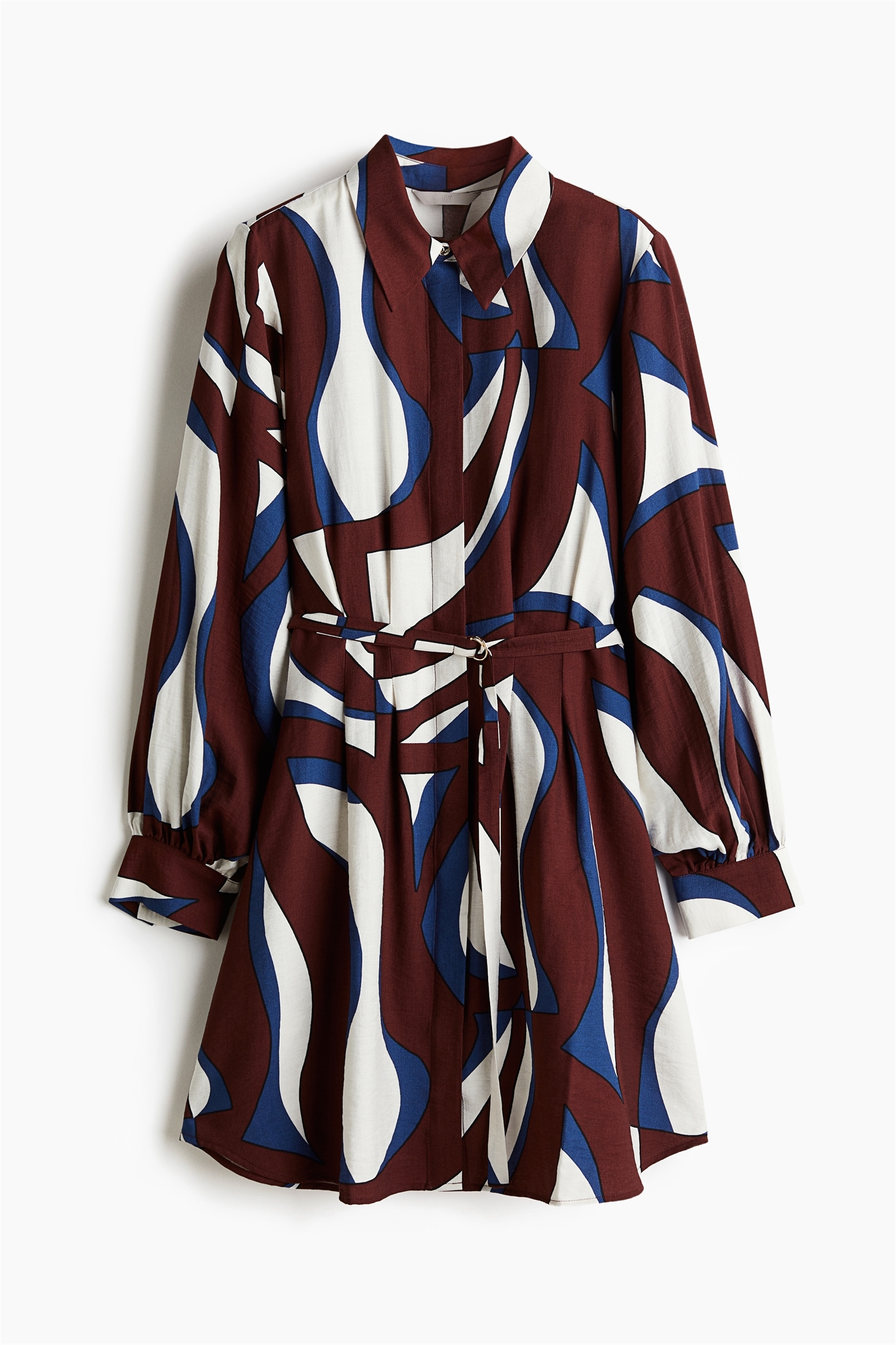 Короткое платье из воздушной ткани с воротником и потайными пуговицами спереди. Длинные рукава-баллон с манжетами на пуговицах, узкий пояс с металлическими D-кольцами и аккуратно закругленный подол. Без подкладки.