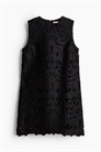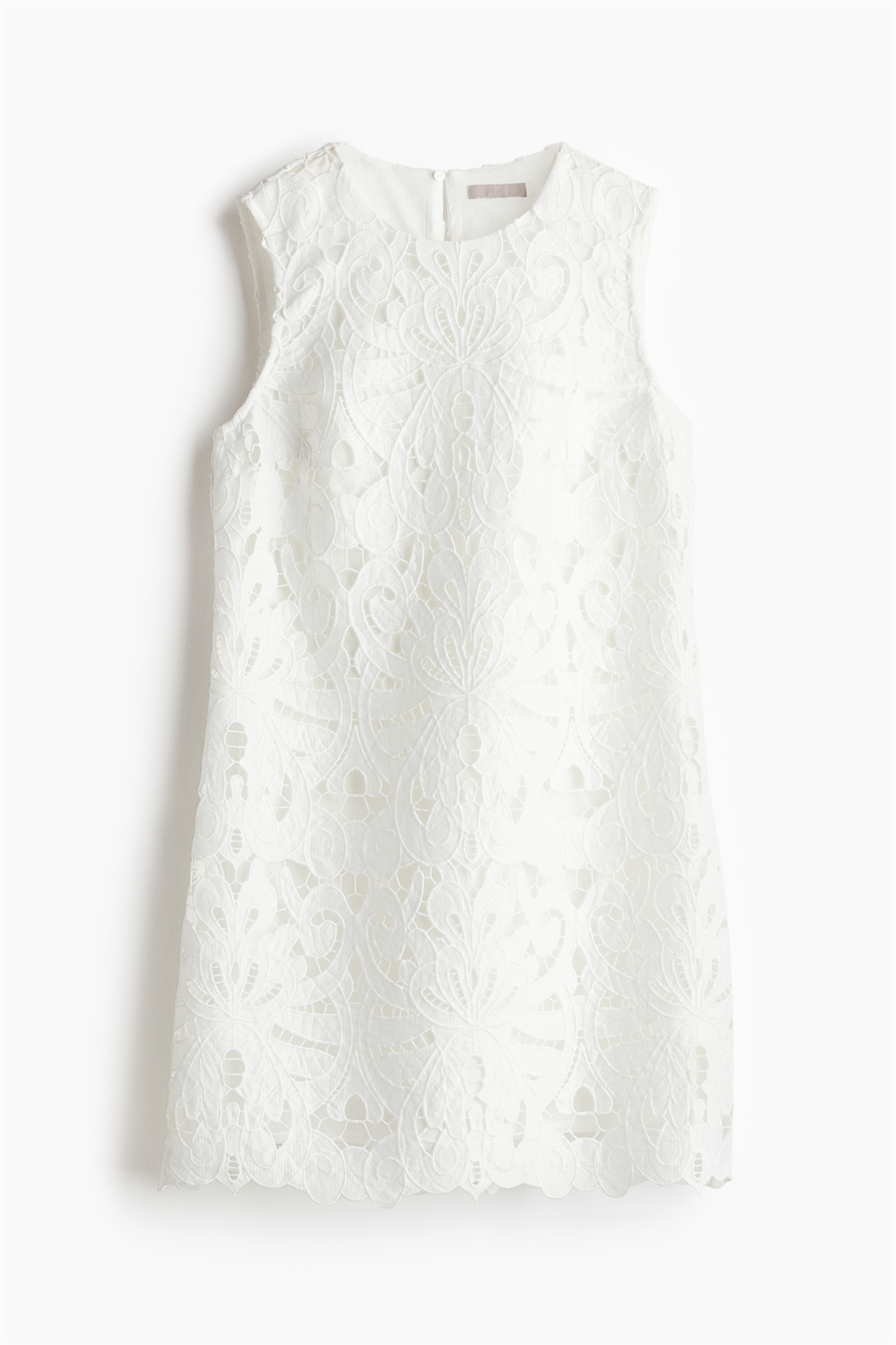 Короткое платье без рукавов из англо-буржуазной парчи с круглым вырезом и отверстием для ключа с потайной пуговицей сзади на шее. Гребешковый подол повторяет вышитый рисунок. Подкладка из хлопкового вуаля.