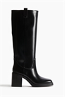 Сапоги до колена из ткани с покрытием, закругленными носками, блочными каблуками и петлями с каждой стороны голенища. Атласная подкладка. Высота подошвы 1,8 см. Каблук 8 см.