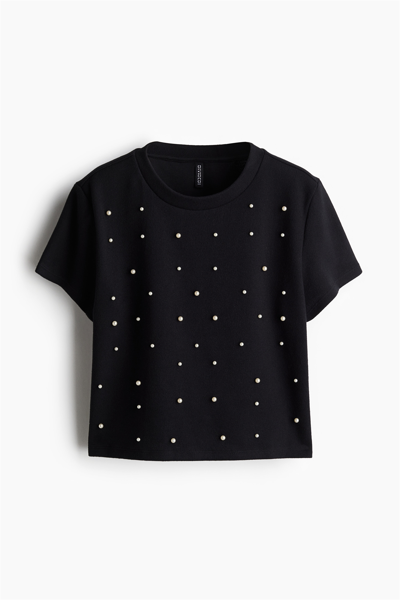 Короткая футболка из мягкого джерси, украшенная спереди жемчужными бусинами.