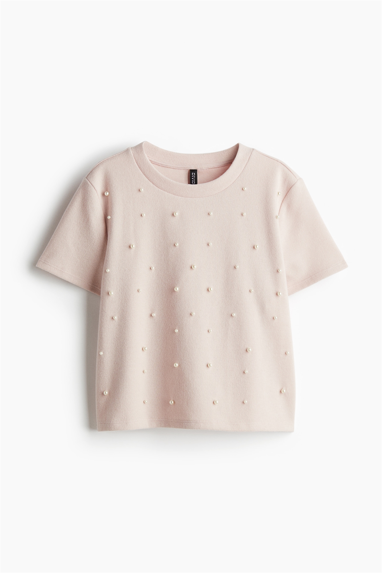 Короткая футболка из мягкого джерси, украшенная спереди жемчужными бусинами.