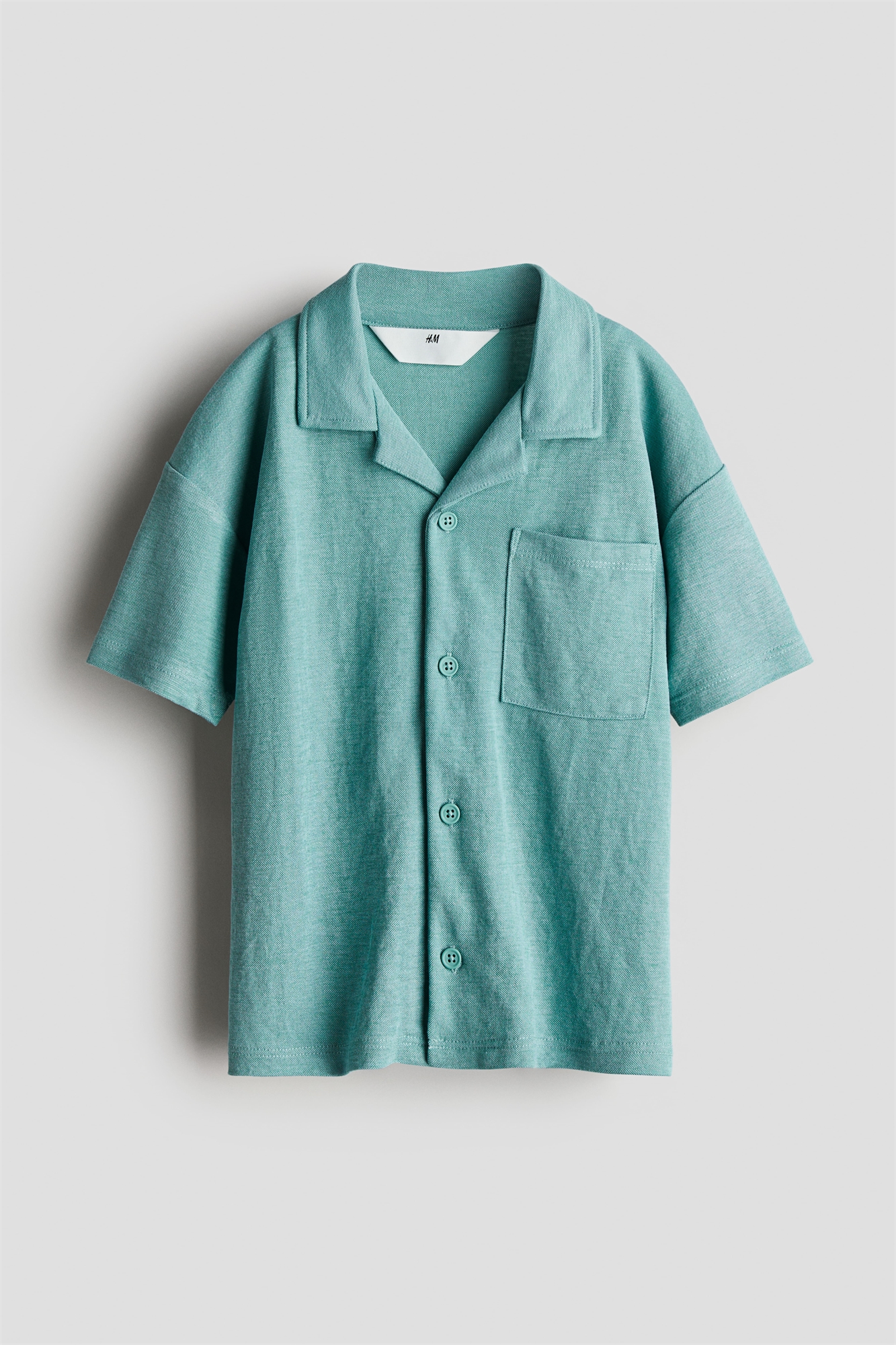 Рубашка из пике с курортным воротником, пуговицами спереди и накладным нагрудным карманом. Спущенные плечи и короткие рукава.