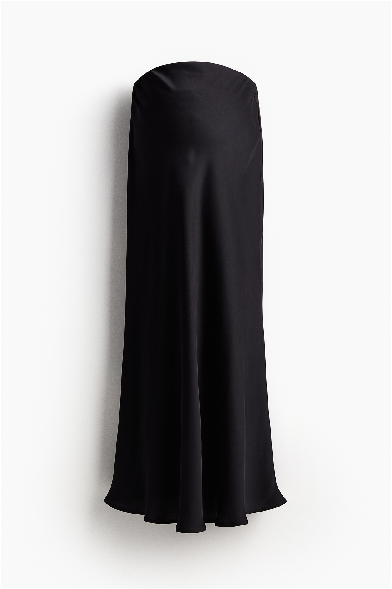 Длинная юбка из мягко драпирующегося атласа с высокой талией и скрытой эластичной резинкой для комфортной посадки на животе.