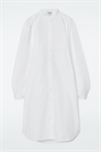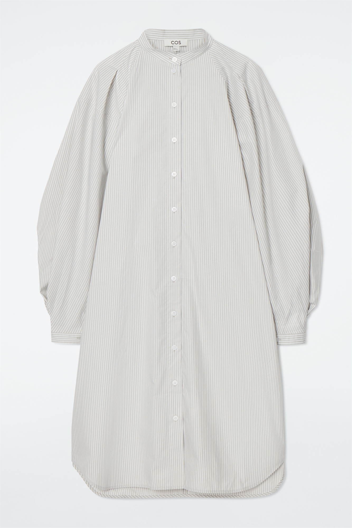 Платье-рубашка - это современная классика и важная часть гардероба COS. Этот миди-вариант украшен полосками цвета капучино, имеет воротник "дедушка" и складки на плечах, которые придают форму объемным рукавам. Платье сшито из легкого хлопка и имеет карманы в боковых швах. Свободный крой Застежка на пуговицы Внешняя ткань: 100% хлопок. Детали исключены/Машинная стирка Длина по спинке в размере ЕС 36 = 100,3 см/Модель носит размер ЕС 36