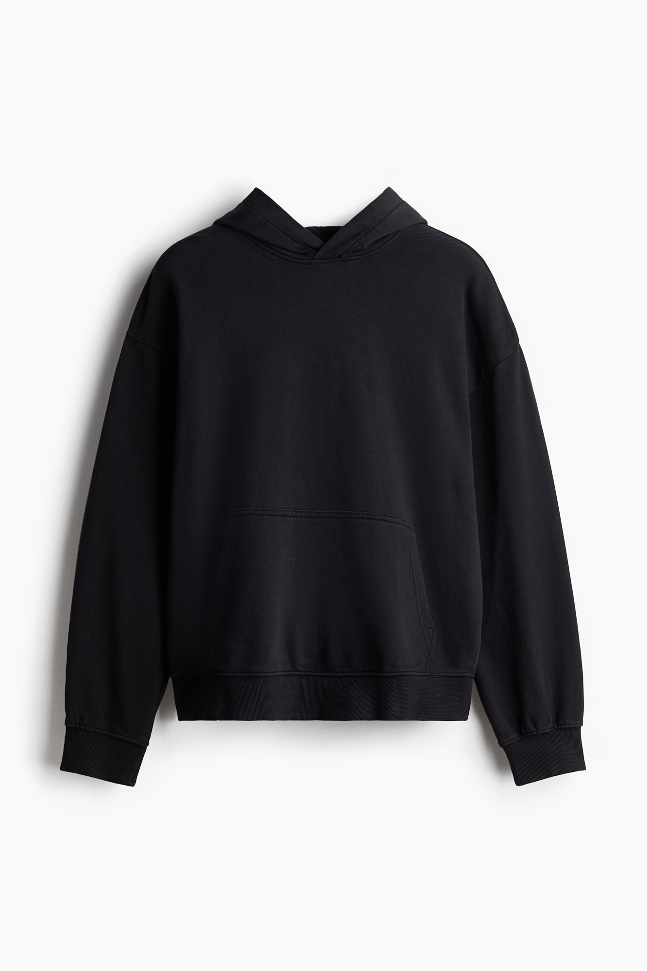 Толстовка из плотной хлопковой ткани с эффектом стирки. Двухслойный капюшон, спущенные плечи и длинные рукава. Карман-кенгуру, манжеты и подол в рубчик. Свободный крой для пышного, но не слишком большого силуэта.