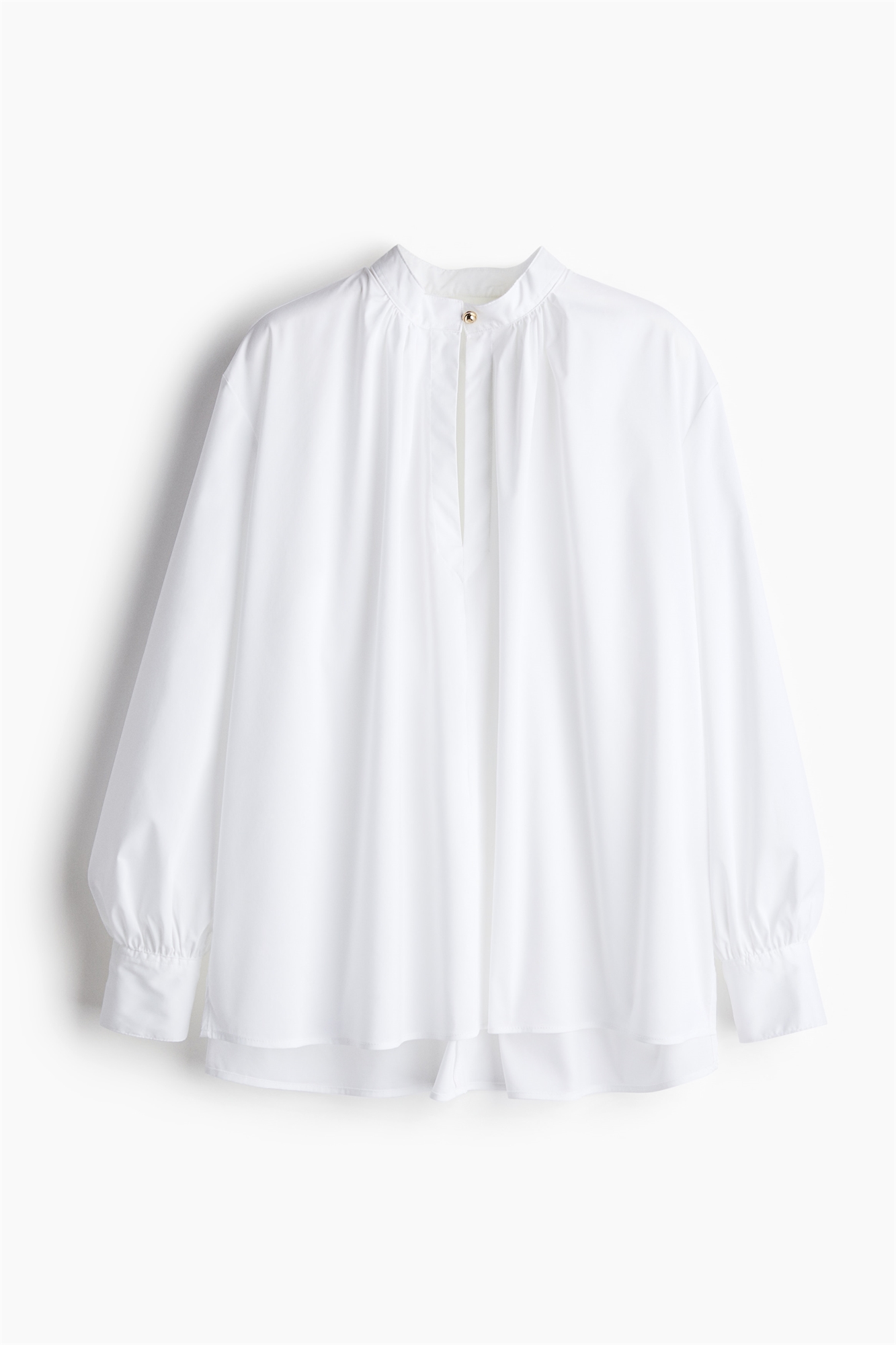 Свободная блузка из тканого материала с воротником-бантом и застежкой на пуговицу спереди. Сборки вокруг воротника, слегка спущенные плечи и длинные рукава с манжетами на пуговицах. Подол прямого кроя с разрезом с каждой стороны. Слегка удлиненный сзади.