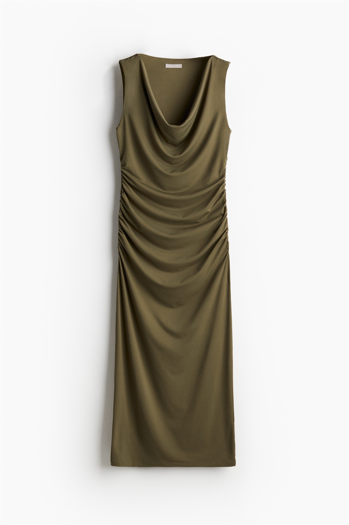Приталенное платье без рукавов из джерси-крэпа длиной до колен с вырезом "коровья лапка" и сборками по бокам для создания драпированного силуэта. Верх на подкладке.