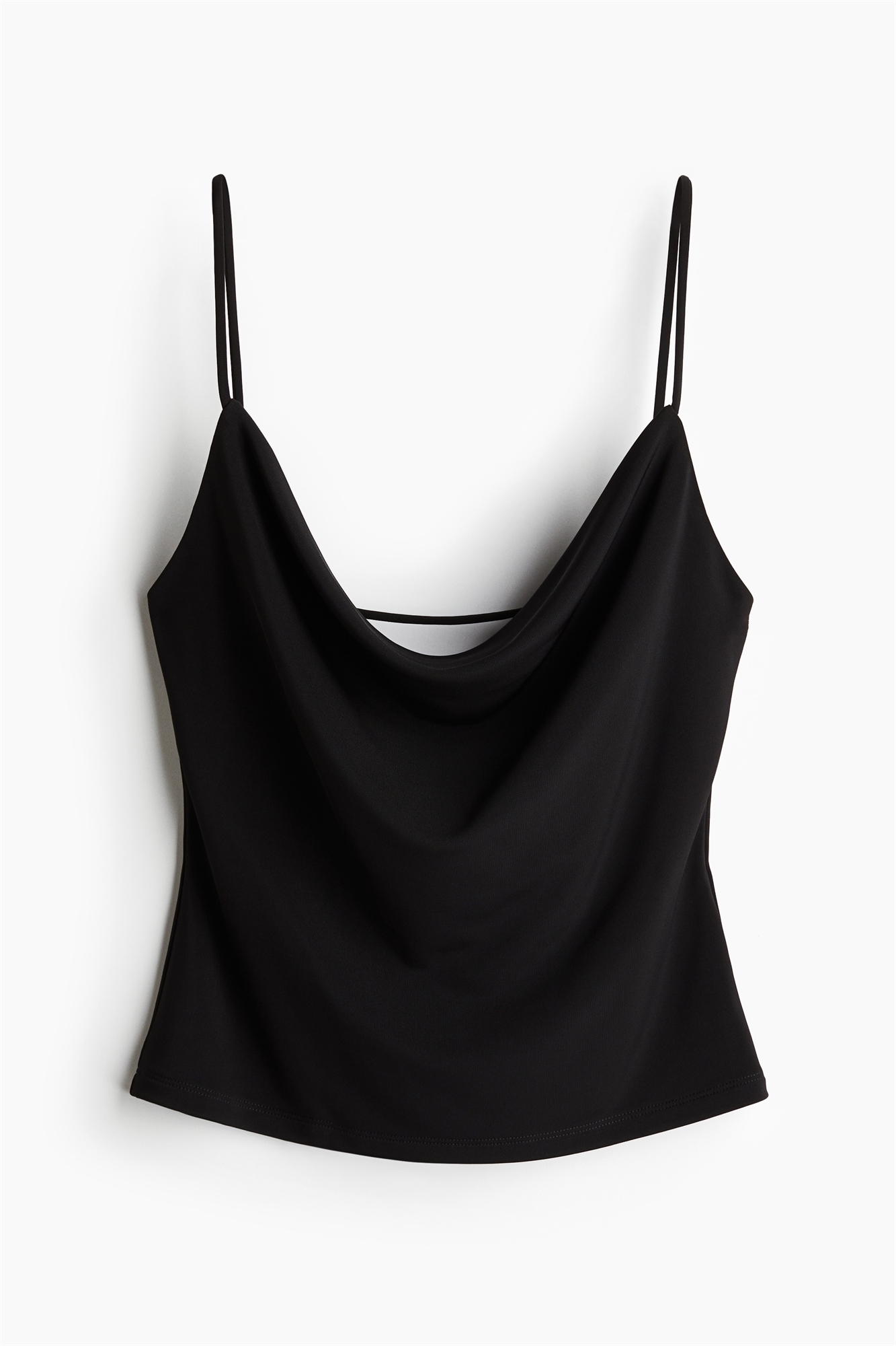Топ из плотного трикотажа с бретелями-спагетти и вырезом "водопад". Глубокий, круглый вырез с горизонтальной бретелью сзади. Частично на подкладке.