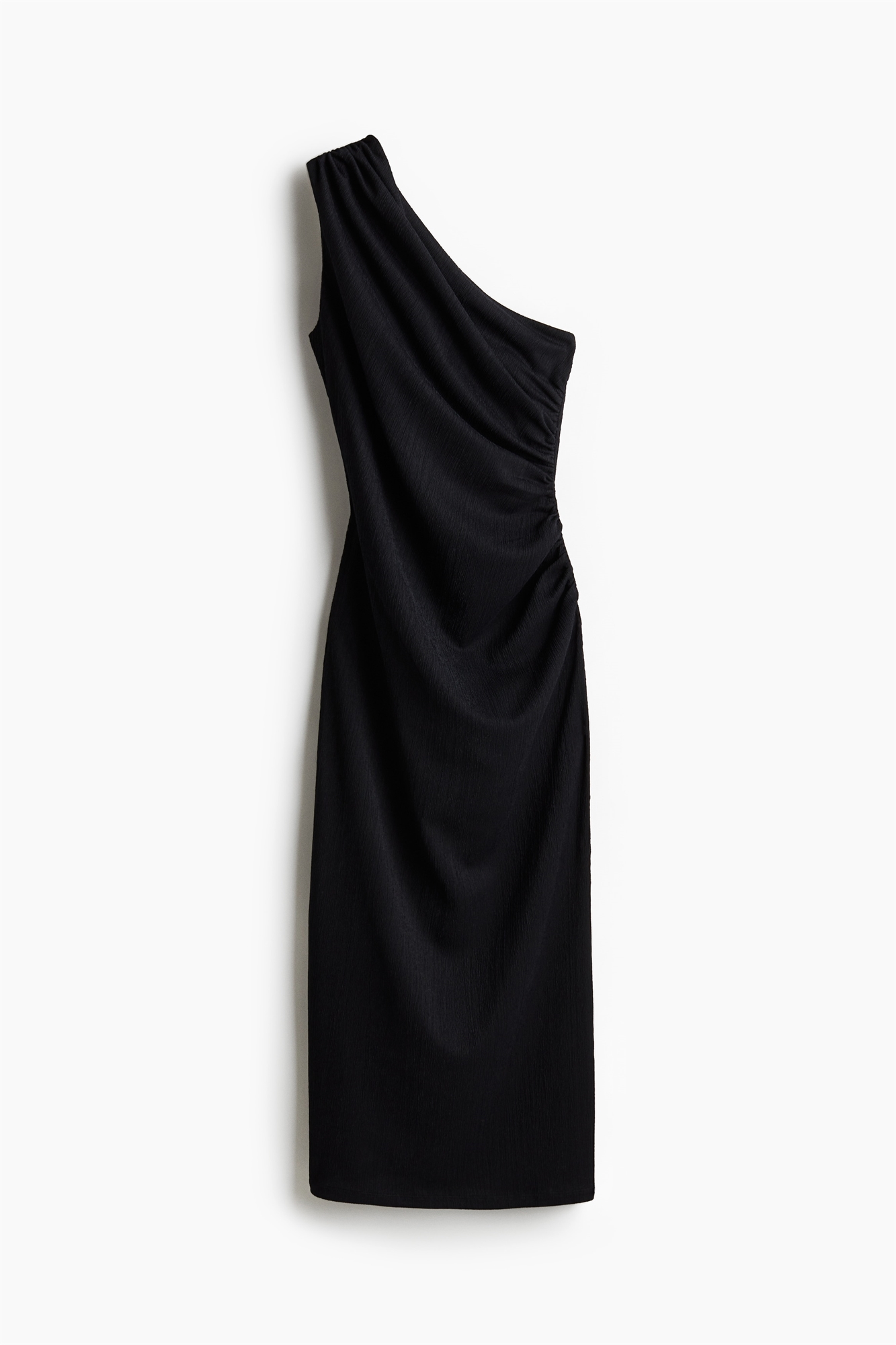 Приталенное платье длиной до колен из фактурного джерси с асимметричным вырезом и одной широкой бретелью. Собирается с одной стороны и на плече, создавая лестный, мягко драпирующийся силуэт.