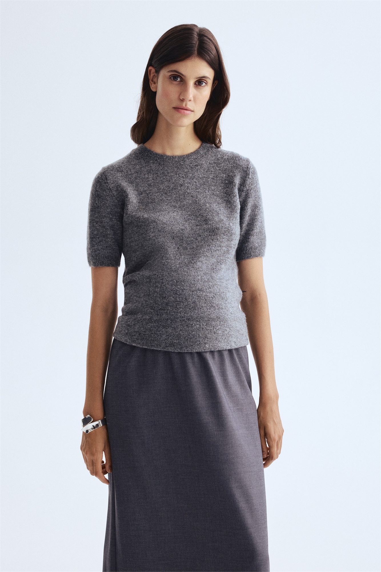 Топ из мягкого тонкого трикотажа с круглым вырезом и короткими рукавами. Окантовка по вырезу, манжетам и подолу.