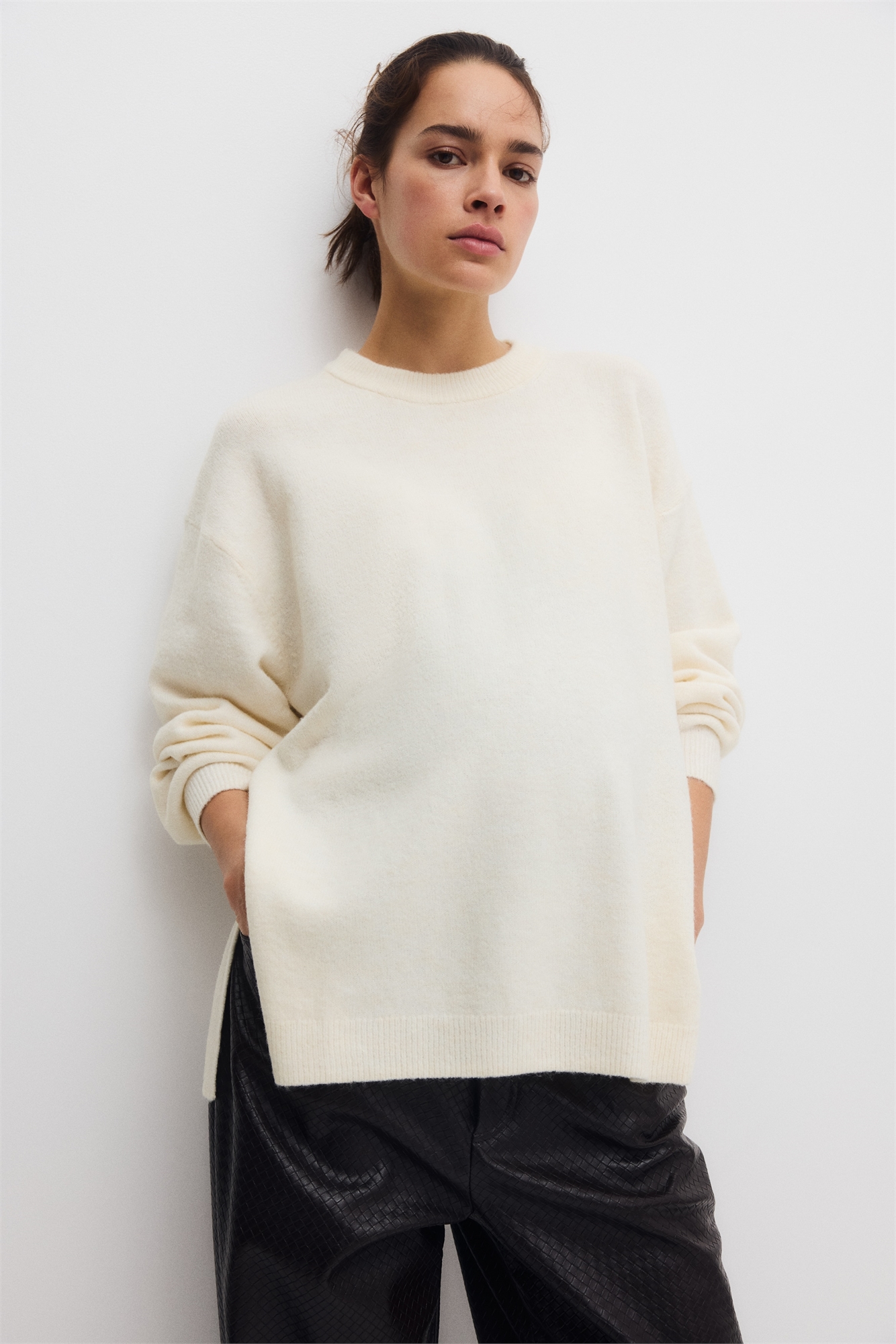 Джемпер из мягкого трикотажа с круглым вырезом, спущенными плечами и длинными рукавами. Прямой подол с разрезом с каждой стороны. Окантовка вокруг выреза, на манжетах и подоле.