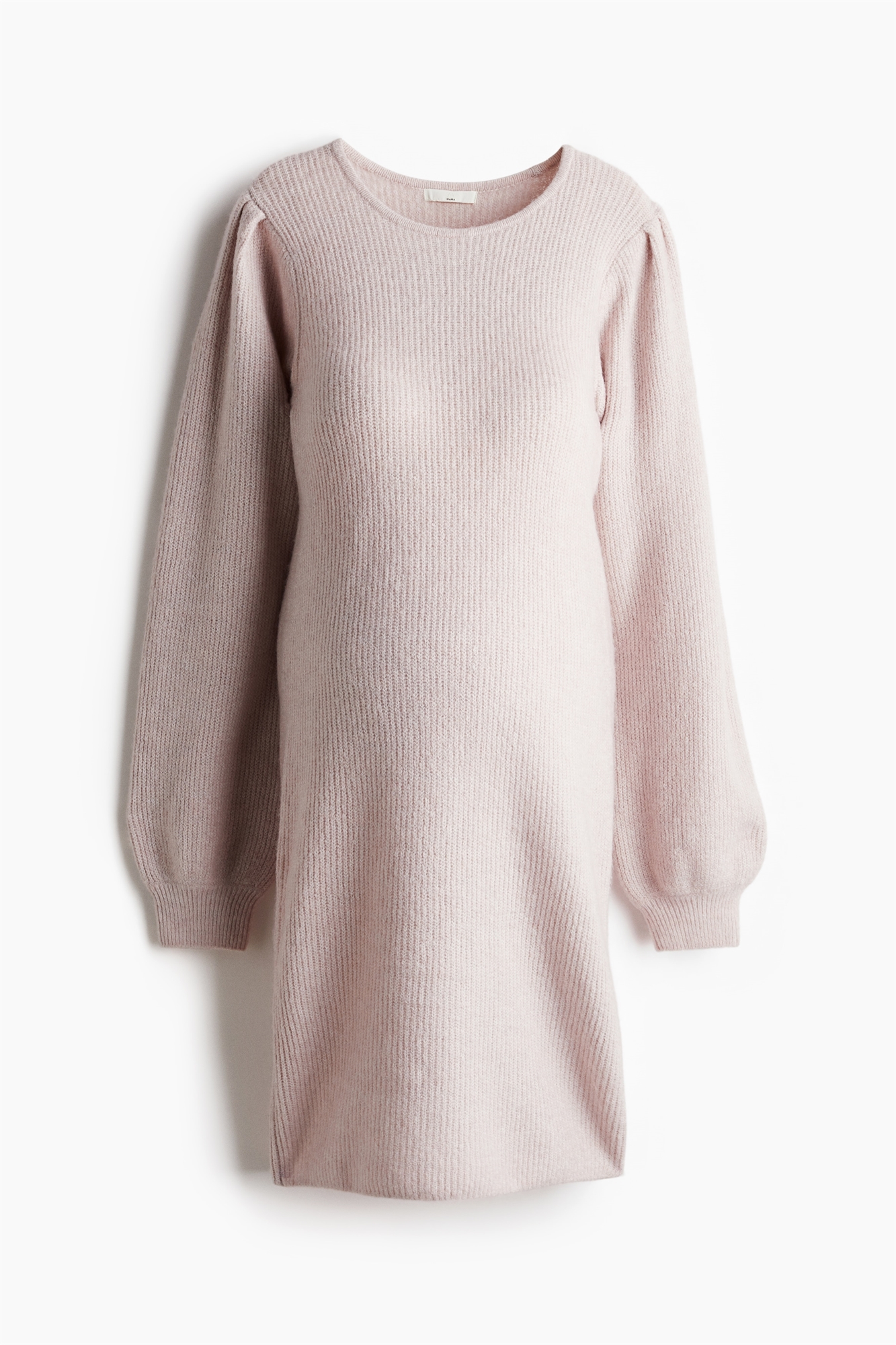 Короткое приталенное платье из мягкого трикотажа в рубчик с круглым вырезом в форме трубы и длинными рукавами-баллонами с облегающими манжетами.