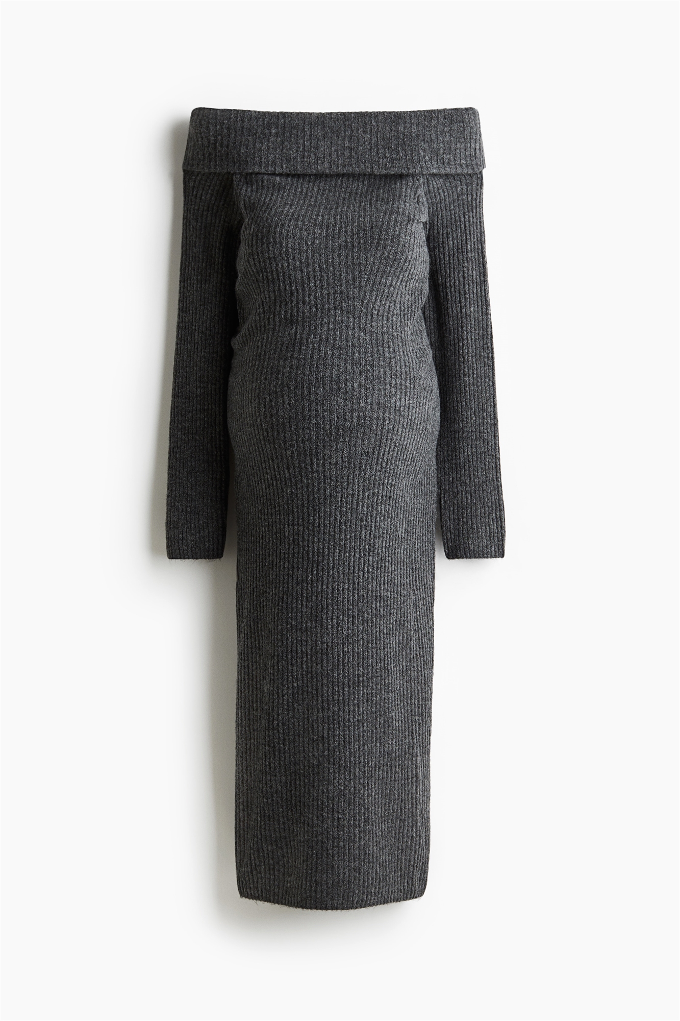 Приталенное платье без плеч длиной до колен из мягкого трикотажа в рубчик. Широкая складка в верхней части и длинные рукава.