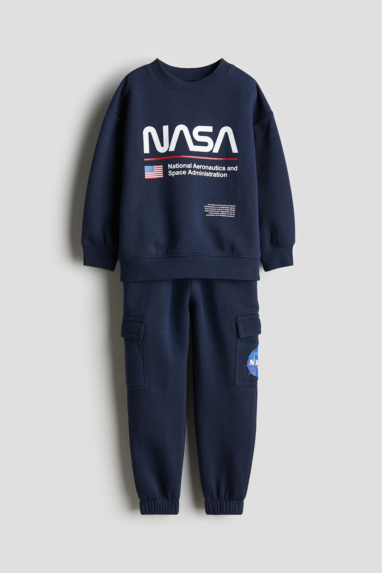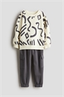 Комплект из толстовки с мягкой ворсистой внутренней стороной. Топ с набивным рисунком спереди, круглым вырезом с ребристой отделкой, спущенными плечами, манжетами и подолом в рубчик. Джоггеры с эластичным поясом на завязках, фальшивой ширинкой и диагональными боковыми карманами. Штанины с накладными карманами и эластичными манжетами.