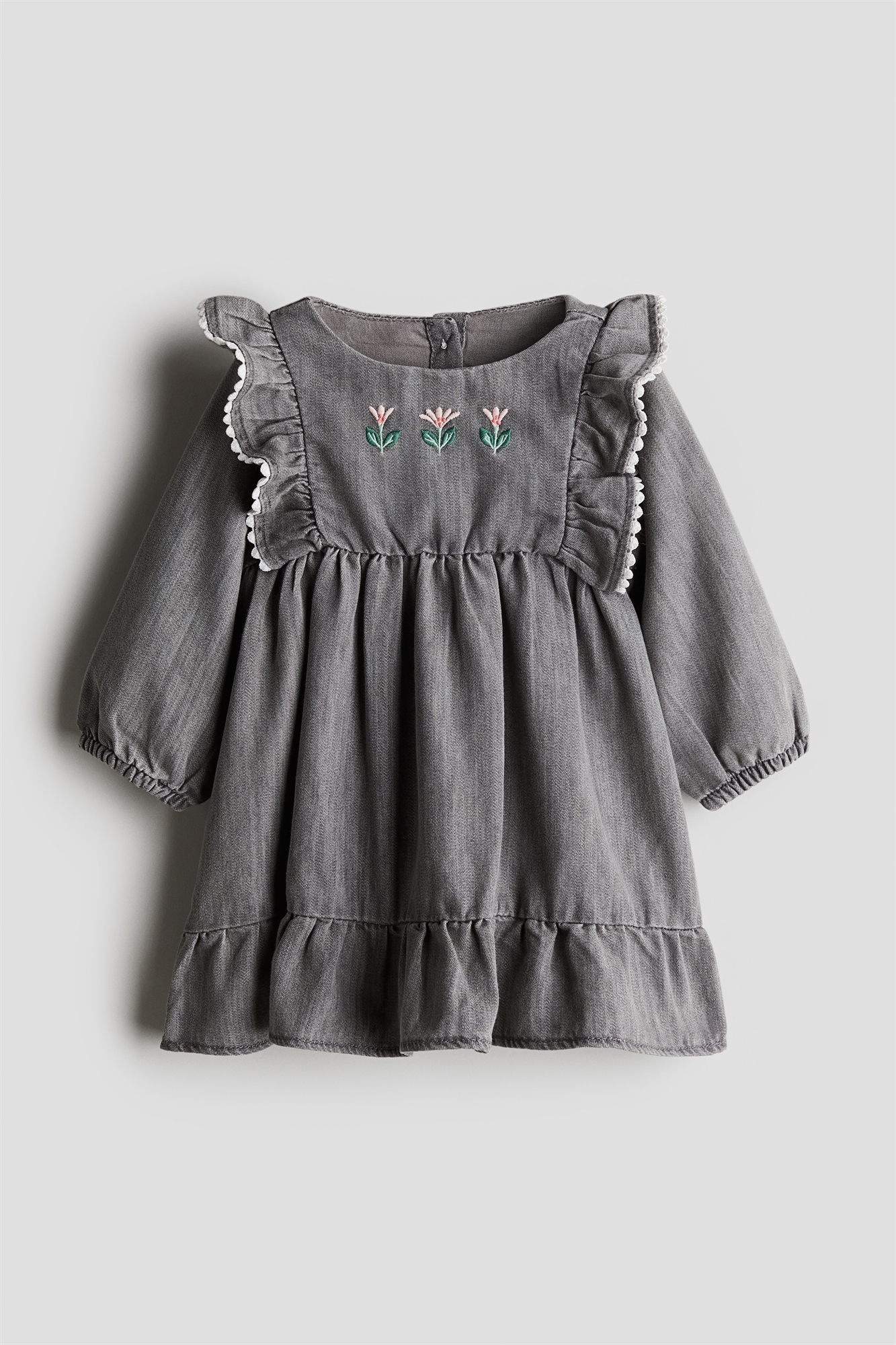 Платье с длинными рукавами из мягкой ткани с декоративной оборкой на плечах. Круглый вырез, застежка на пуговицы сзади, эластичные манжеты и сборки в верхней части и над подолом. Частично на подкладке.