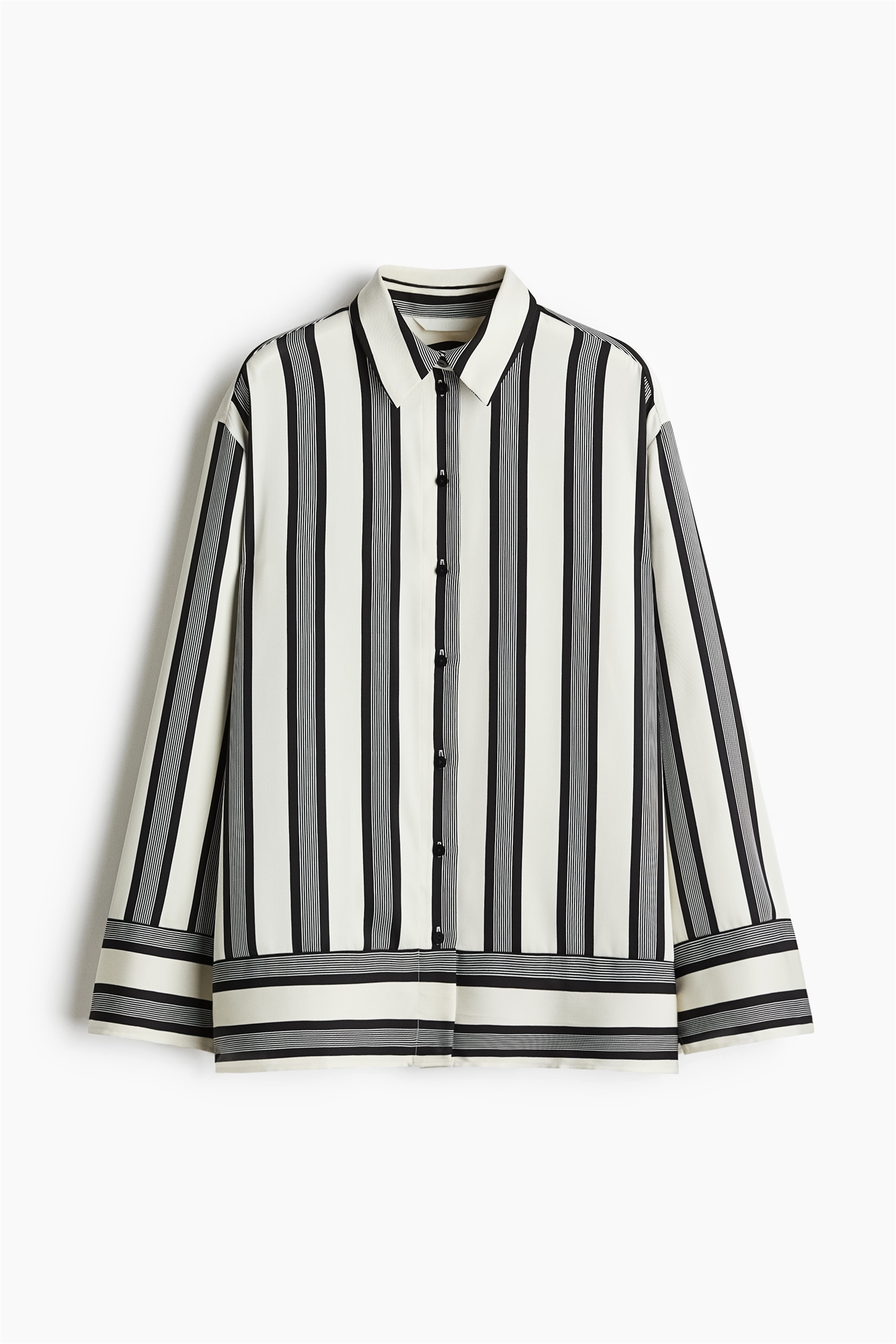 Свободная рубашка из тканого материала с воротником и пуговицами спереди. Сзади иголка, слегка спущенные плечи и длинные рукава. Широкая отделка на манжетах и подоле.
