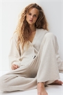 Кардиган из мягкого тонкого трикотажа с глубоким V-образным вырезом и пуговицами спереди. Спущенные плечи, длинные рукава и окантовка манжет и подола.