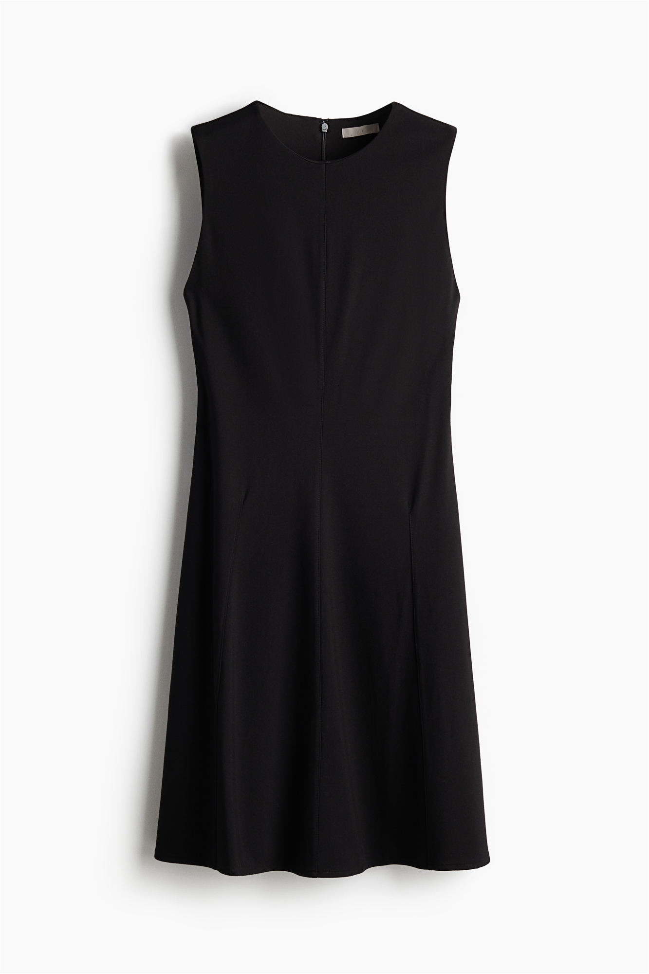 Платье без рукавов из плотного джерси с круглым вырезом и потайной застежкой на молнию и крючок-глазок сзади. Аккуратная зауженная талия и расклешенная юбка.