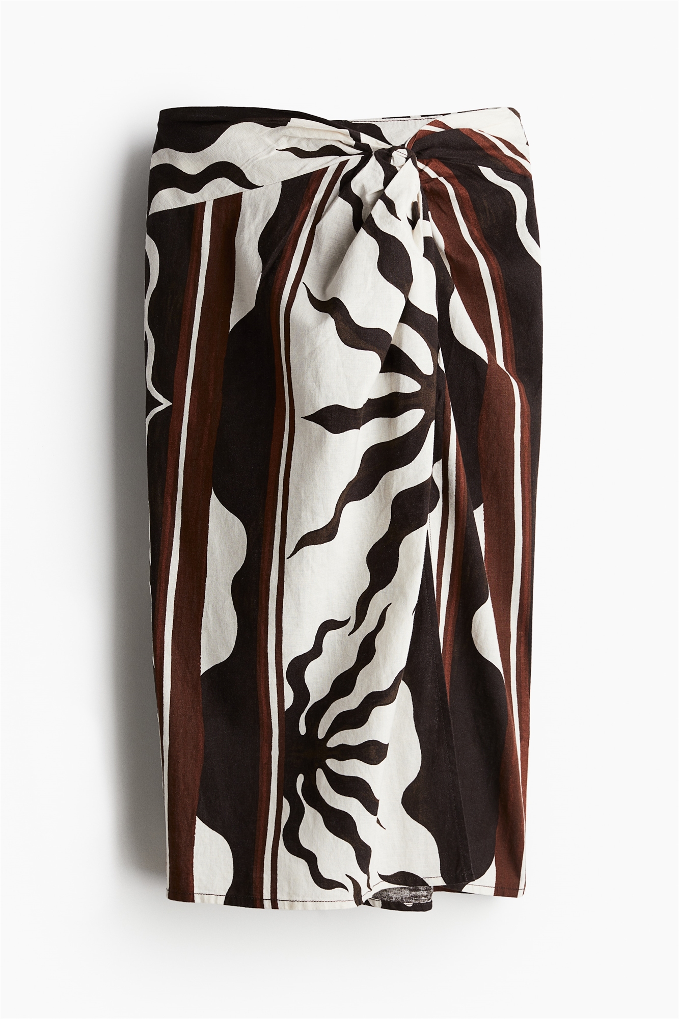 Юбка длиной до колена из воздушного льна и хлопка с перекрученной деталью на талии, создающей эффект драпировки. Скрытая застежка на молнию и крючок с одной стороны, разрез спереди. Без подкладки.