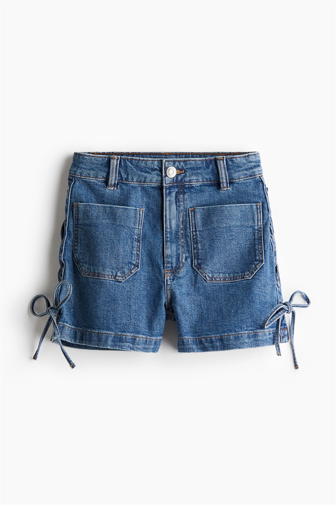 Облегающие шорты из хлопкового денима с легким стретчем для комфорта. Регулярная талия, ширинка на молнии и пуговице, накладные передние и задние карманы, шнуровка по бокам и небольшой разрез на подоле.