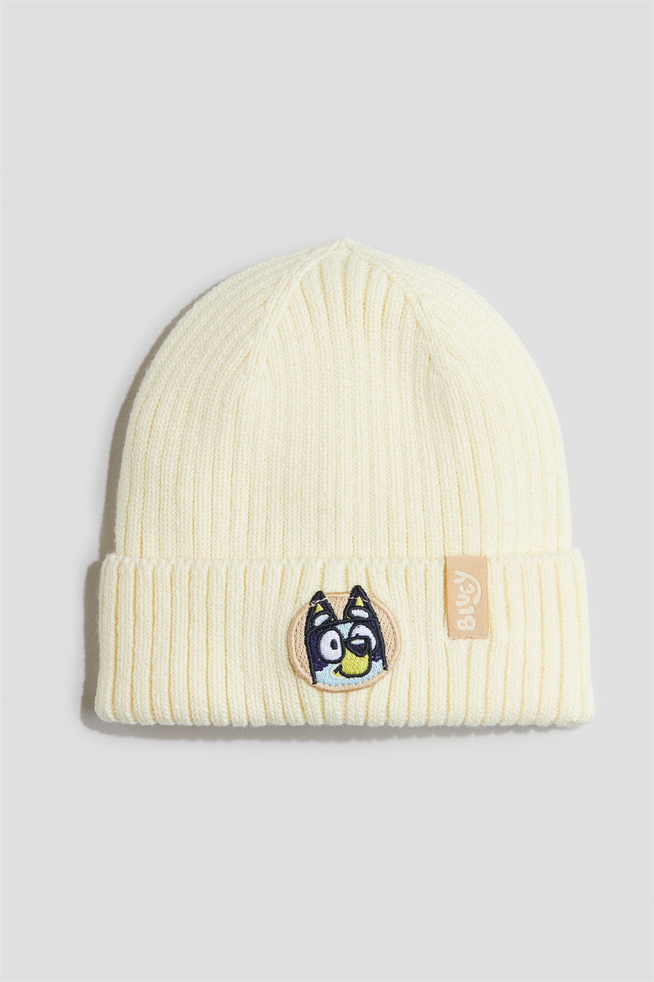 Бини из мягкого трикотажа в рубчик с подворотом на подоле и вышитой аппликацией спереди.