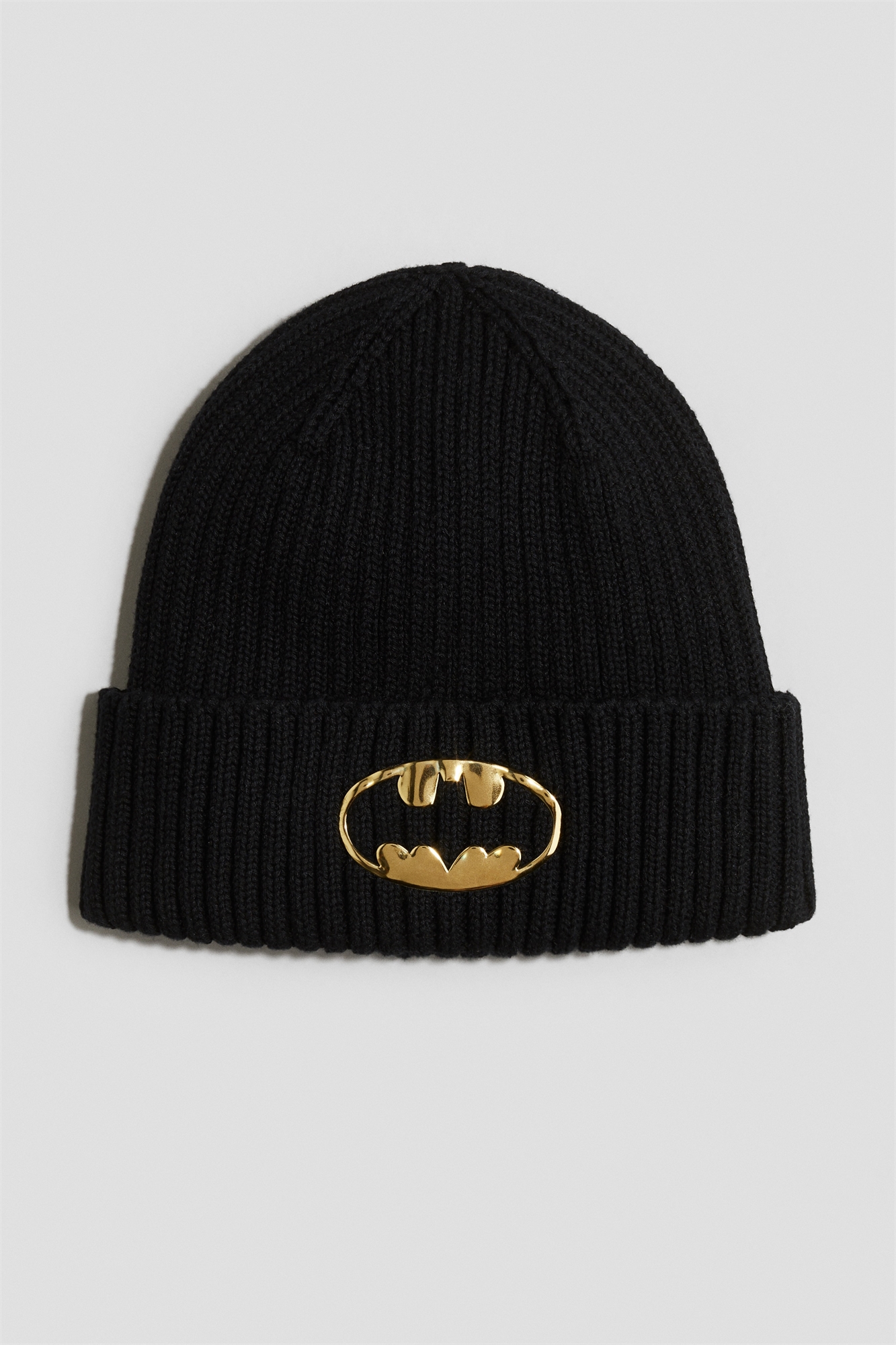 Бини из мягкого трикотажа в рубчик с подворотом на подоле и вышитой аппликацией спереди.