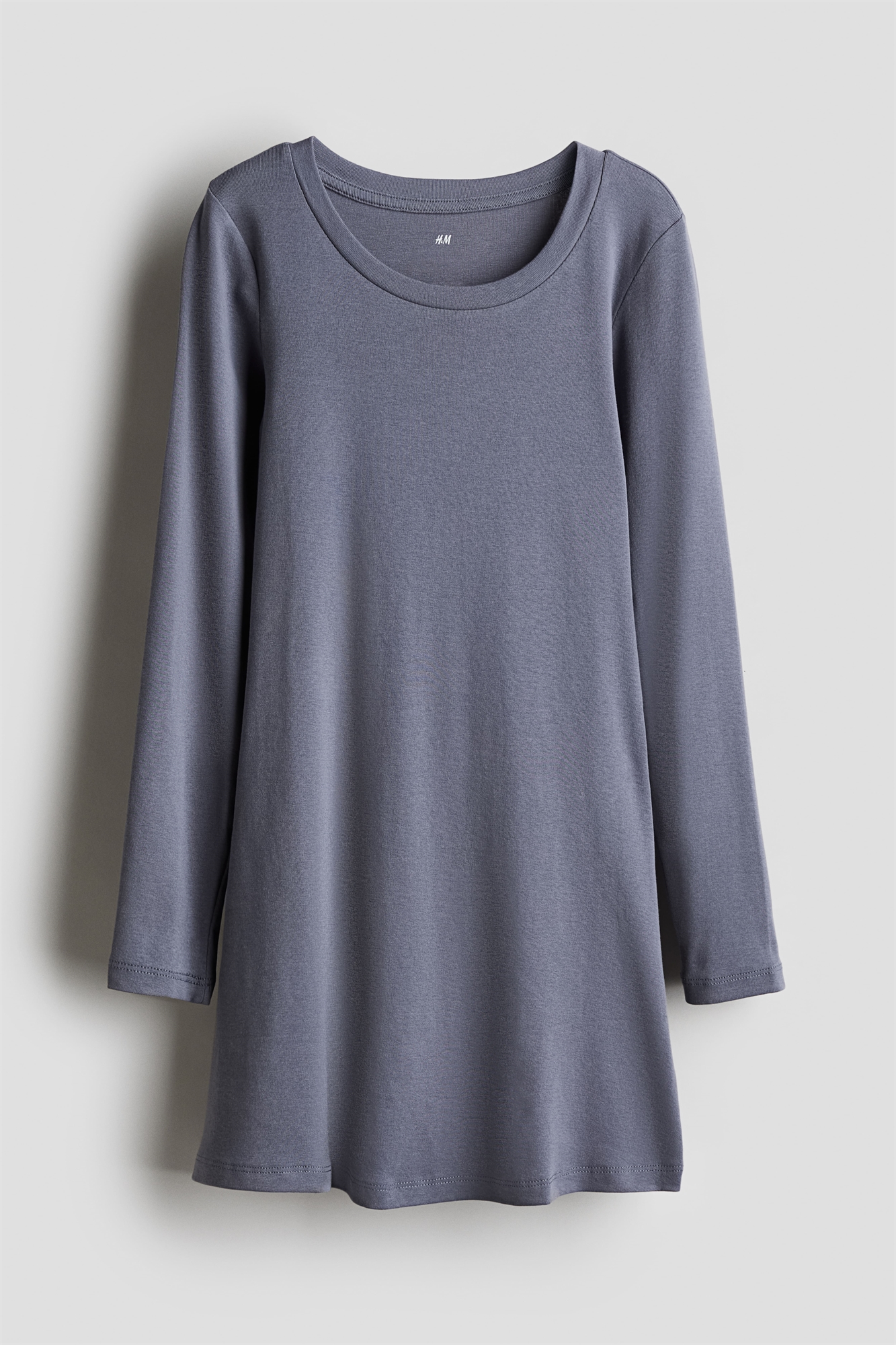 Расклешенное платье из мягкого хлопкового джерси с круглым вырезом и длинными рукавами.