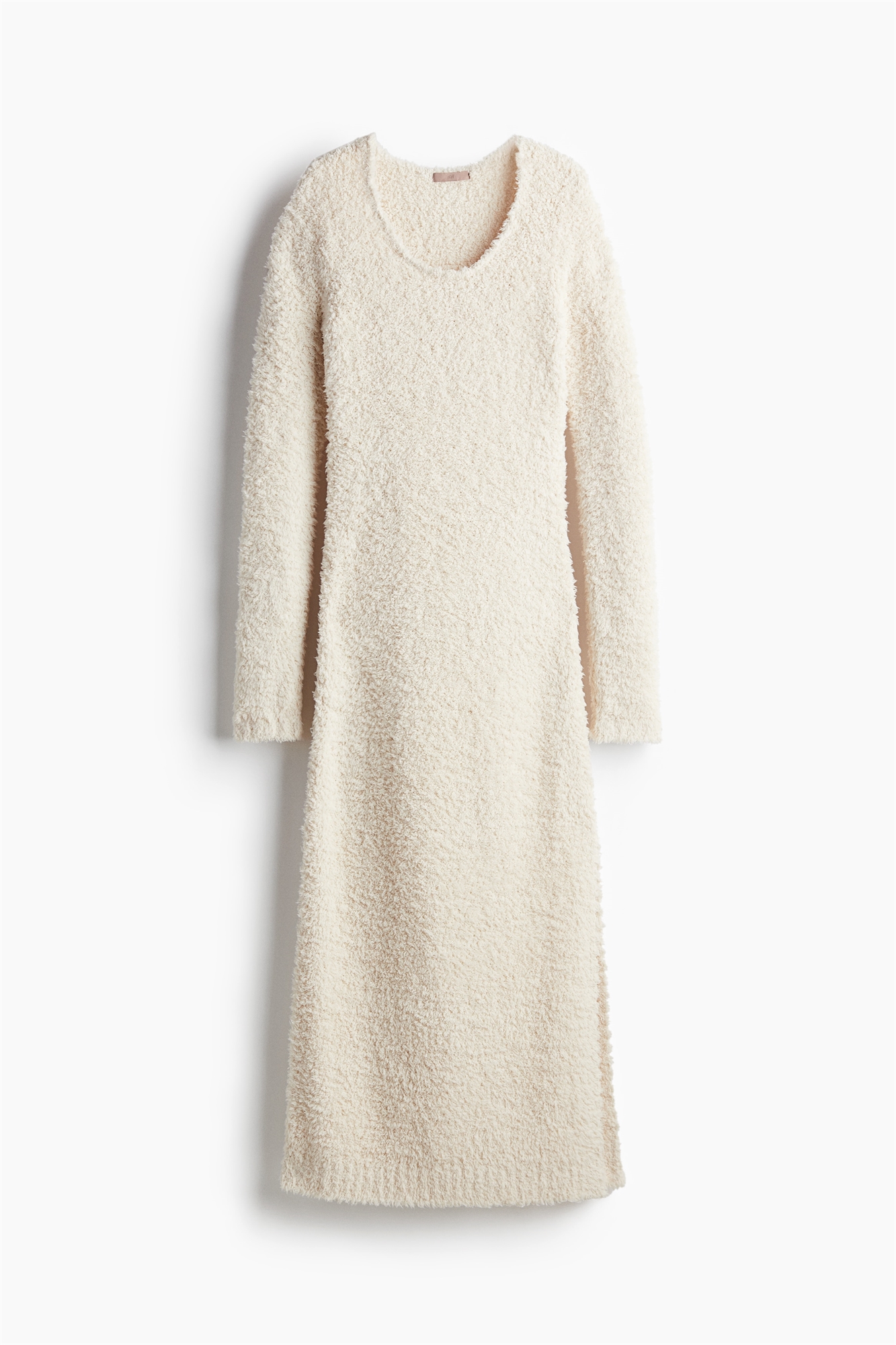 Длинное приталенное платье из мягкого пушистого трикотажа с вырезом-лодочкой и длинными рукавами с манжетами в рубчик. Ребристый подол с разрезом с одной стороны.